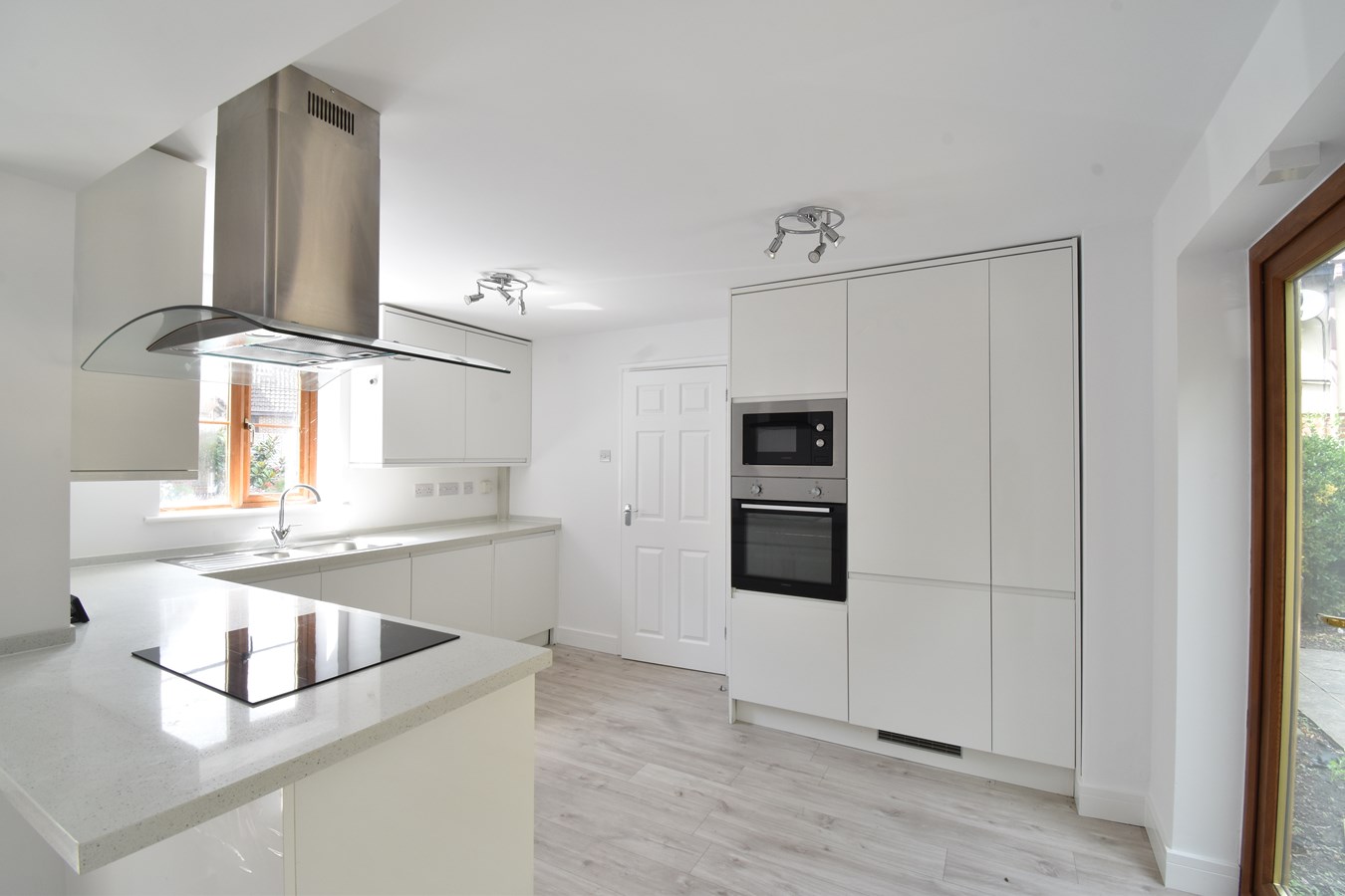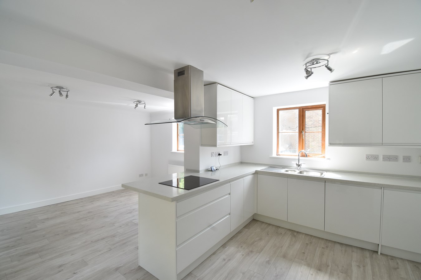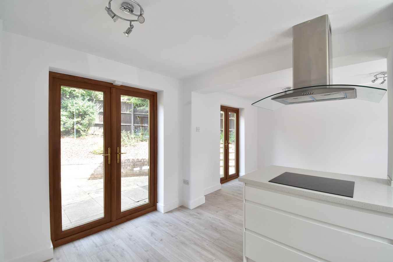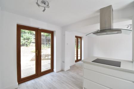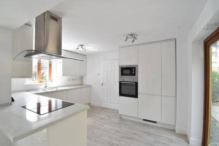 20' 6" x 13' 3" (6.25m x 4.04m) Two double glazed windows to front. Two sets of double glazed French doors to rear. Modern fitted range of base and wall units. Sink and drainer. Induction hob with extractor above. Integrated microwave, electric oven, tall fridge/freezer, dishwasher and washing machine. Breakfast bar. TV & BT point. Radiator.