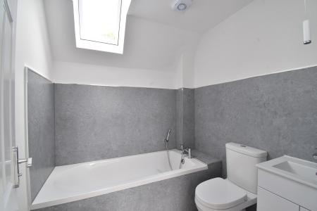 Double Velux window to rear. Radiator. Extractor. Suite comprising of low level WC, wash hand basin cupboard underneath. Bath with shower attachment.