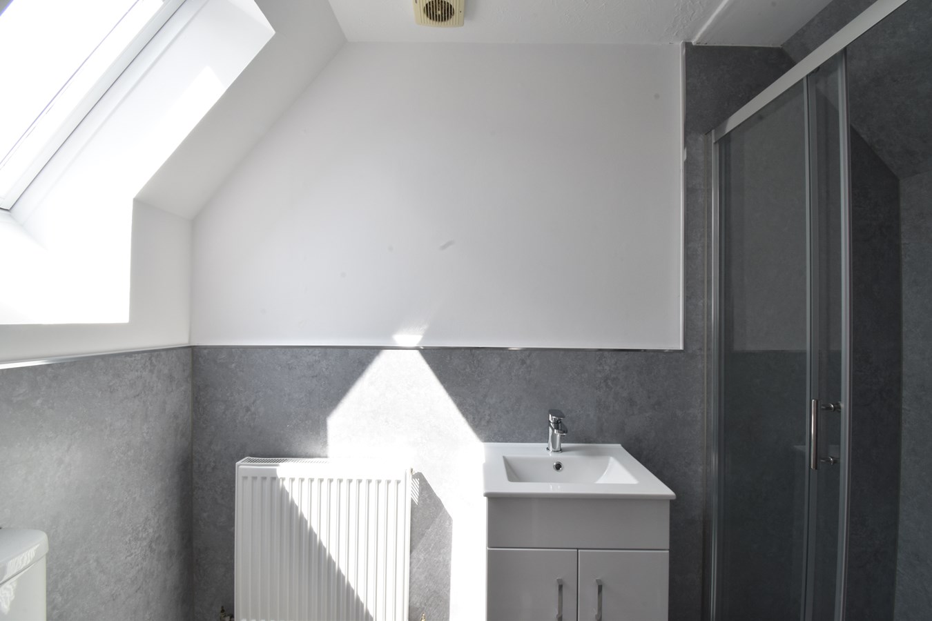 Double Velux window to front. Suite comprising of low level WC, wash hand basin with cupboard and shower with glass screen. Radiator. Extractor.
