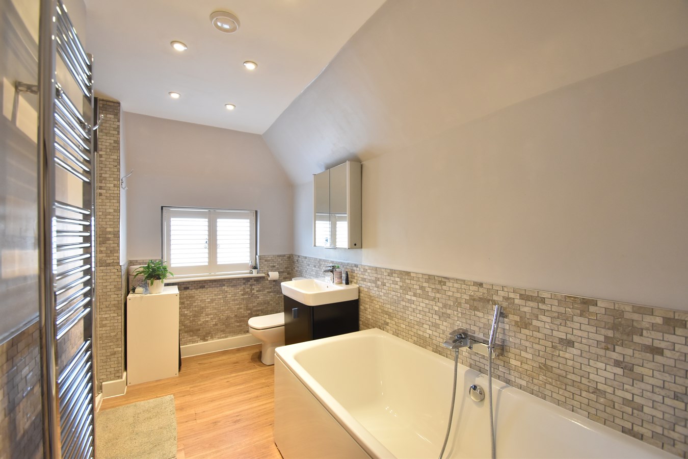 Frosted window to side. Contemporary suite of low level WC. Rectangular designer vanity hand basin. Large panelled bath. Large double shower enclosure. Chrome towel rail. Part tiled walls. Extractor. Downlighting