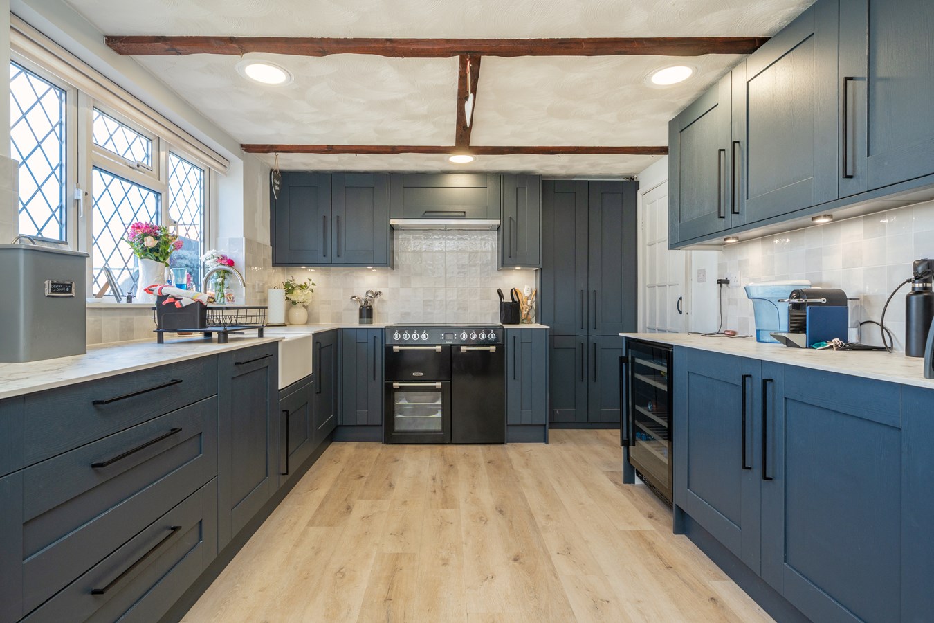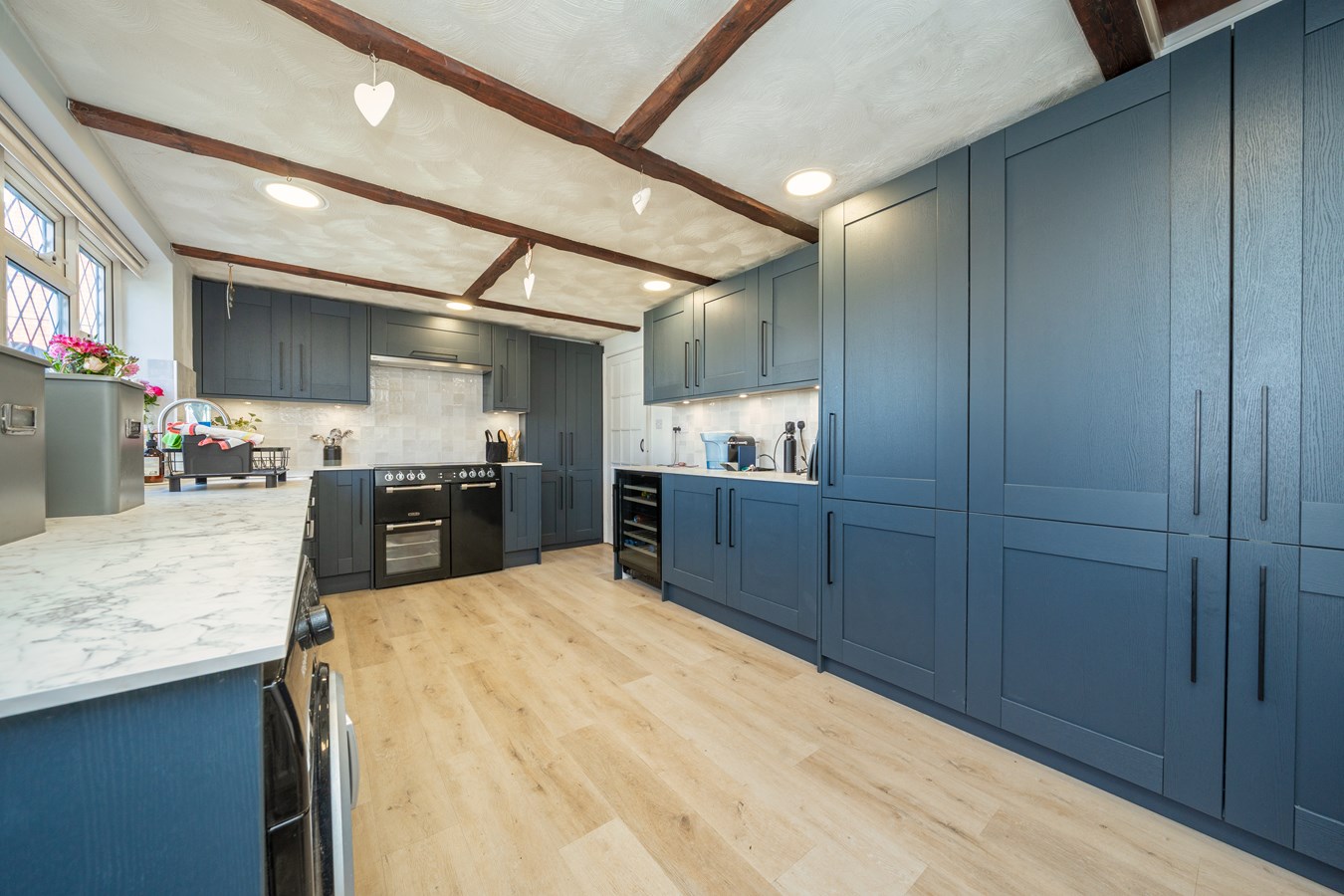 The property immediately impresses with a large and welcoming entrance hall, setting the tone for the accommodation that follows. The bright and comfortable reception room provides the perfect space to relax, which is open to the dining room that offers an ideal setting for entertaining or family meals. The kitchen has been recently refitted to a high standard and is thoughtfully designed with a range of integrated appliances, including a wine cooler, fridge freezer and washing machine, creating a sleek and functional space for modern living.