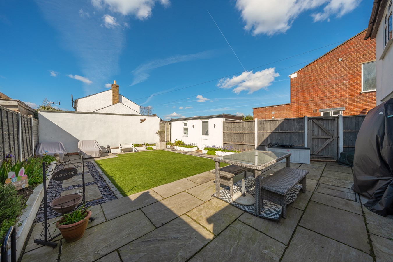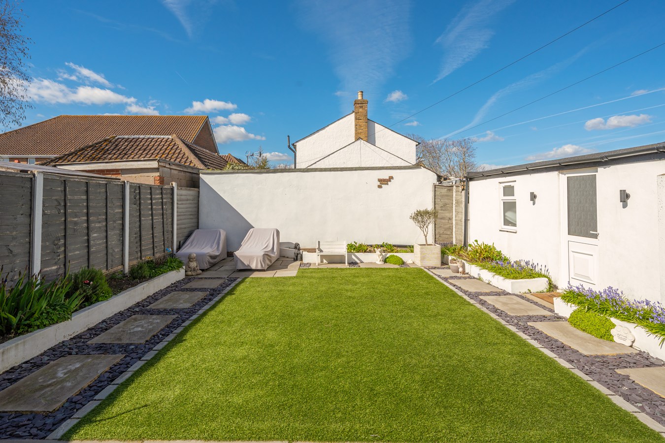 Externally, the rear garden has been designed with ease of maintenance in mind, featuring artificial grass and offering a high degree of privacy, perfect for those looking to enjoy outdoor space without the upkeep. The garage, accessed via a shared driveway, offers excellent storage or potential for a home office setup.
