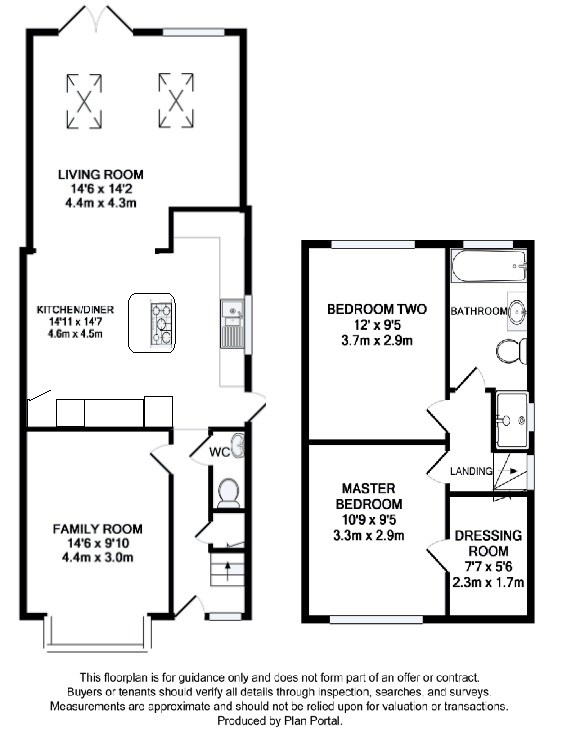Upstairs, there are two well-proportioned double bedrooms, with the principal bedroom benefitting from a walk-in dressing room, adding a touch of luxury and practicality. The family bathroom is well appointed, comprising a bath, basin and WC, alongside the added benefit of a walk-in shower.