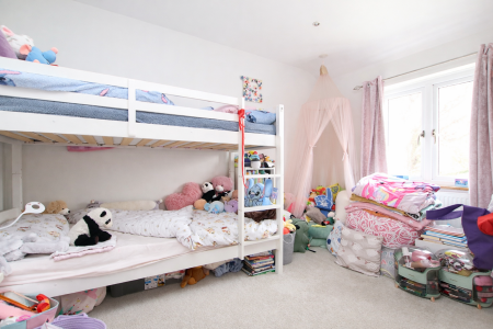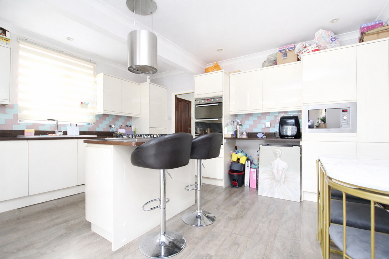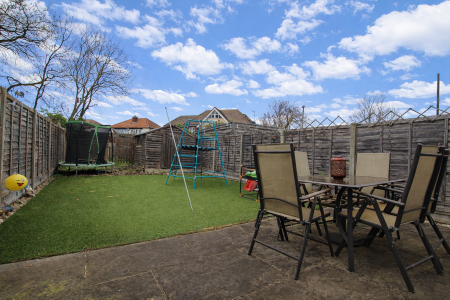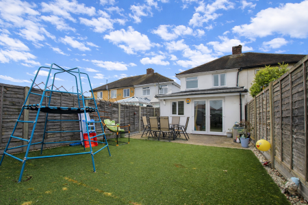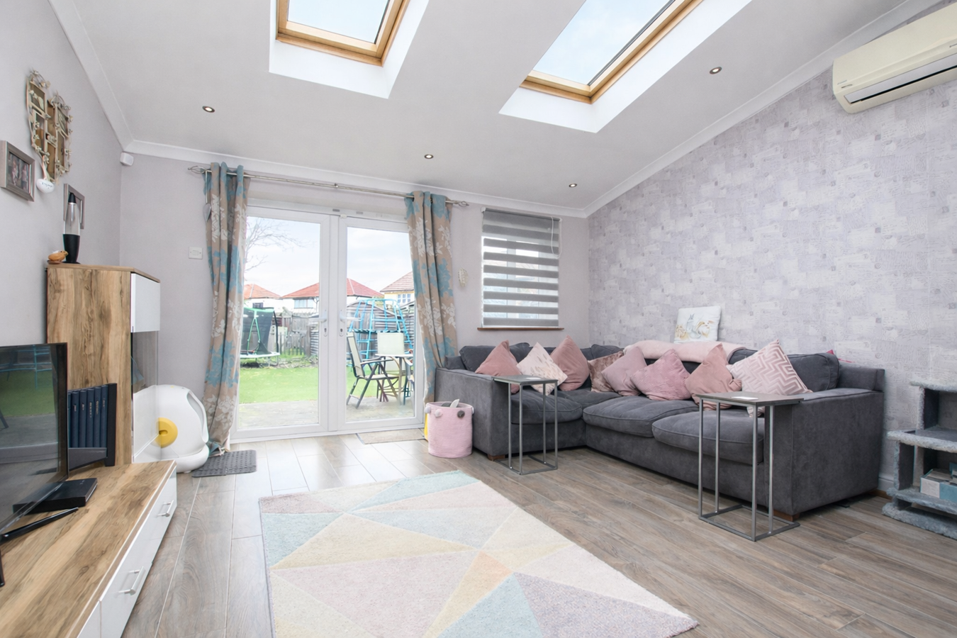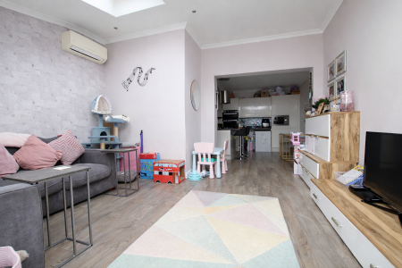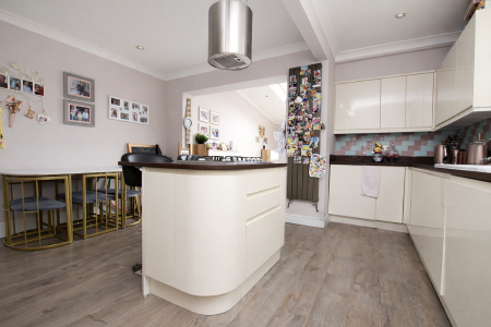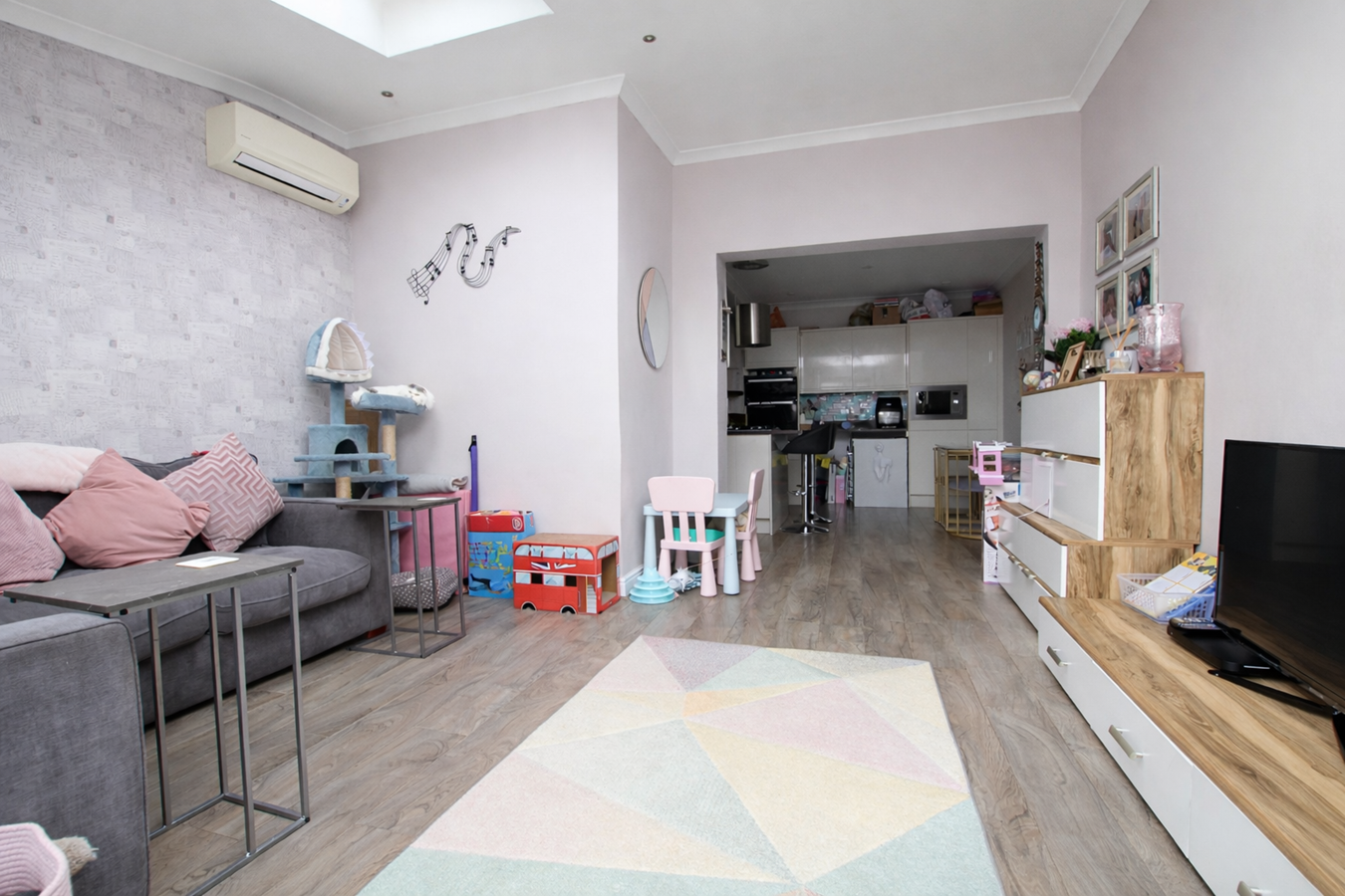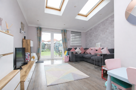 To the front of the property, a separate reception room provides real flexibility, currently used as a play room but equally suited as a third bedroom, living room or home office depending on your needs. The heart of the home lies to the rear, where the property has been extended to create a generous kitchen/dining space opening into a superb living area. The extension features vaulted ceilings with Velux windows, flooding the space with natural light and creating a bright and airy environment perfect for both everyday living and entertaining.
