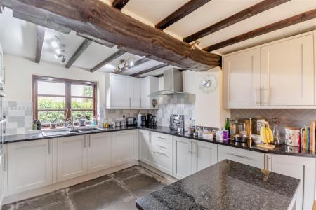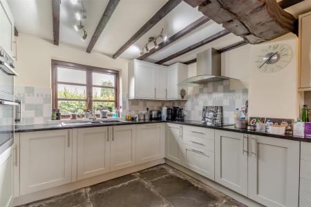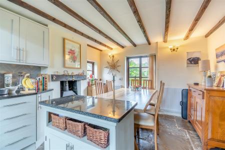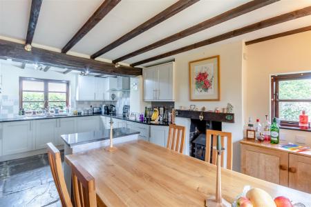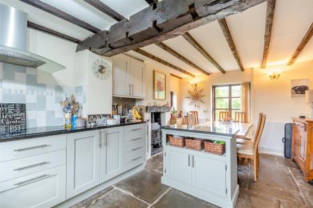 Kitchen / Dining Room - 5.59m x 3.45m (18'4 x 11'4) - The kitchen has a range of base, wall and drawer mounted units, one and a half bowl single drainer sink unit with mixer tap over, built-in oven and grill, integrated dishwasher, five ring hob with extractor fan over, kitchen island with cupboards below, space for fridge / freezer, flagstone flooring, space for large table and chairs, exposed wooden beams, inset wood burning stove with stone hearth and wooden mantle over, two radiators, front and side aspect double glazed window.