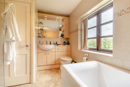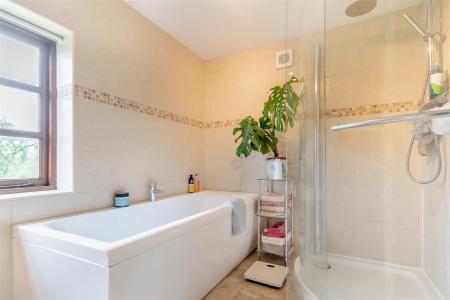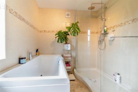 Bathroom - Suite comprising separate walk-in shower and bath, low-level WC, vanity wash hand basin with cupboards below, tiled walls, extractor fan, heated towel rail, rear aspect double glazed wooden window.