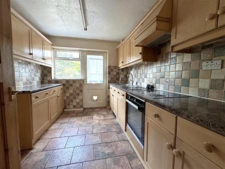 Kitchen - 3.15m x 2.64m (10'4 x 8'8) - Range of base and wall mounted units with laminated worktops and tiled splashbacks, one and a half bowl stainless steel sink unit, four ring hob, oven and extractor fan, integrated fridge and dishwasher, tiled flooring, rear aspect window, glazed wooden door into: