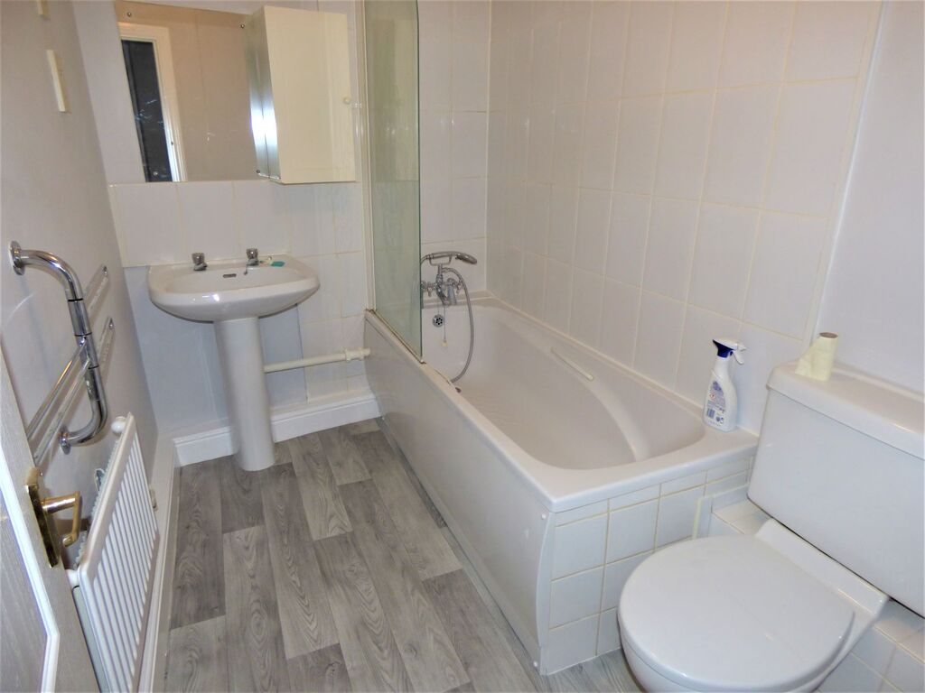 Matching white suite comprising: panel enclosed bath with mixer shower & fitted screen, pedestal wash hand basin & low level WC. Fitted mirror and shaver point. Extractor. Wood effect flooring.