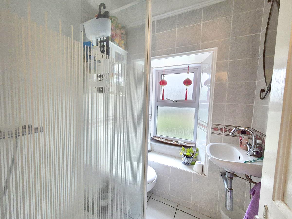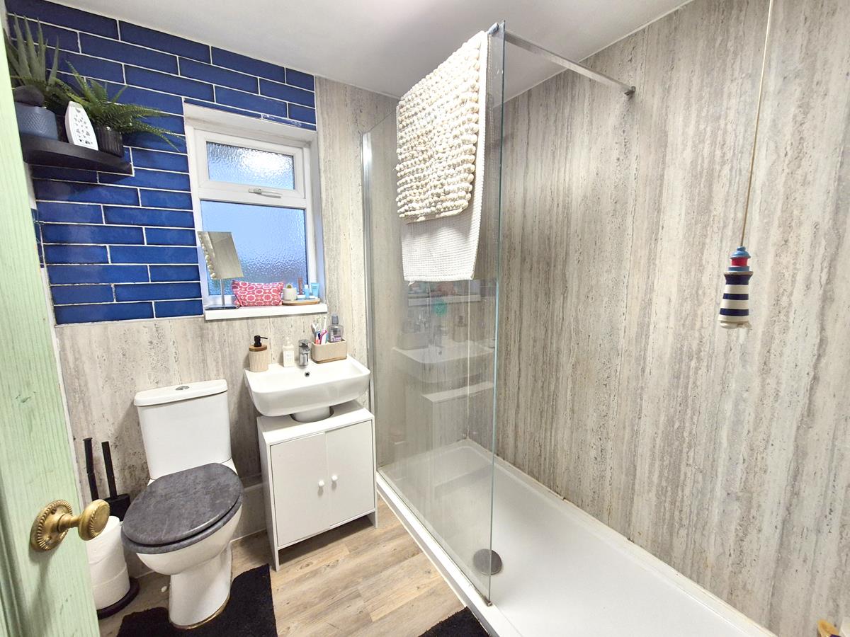 Shower Room - Comprising a walk-in shower, pedestal wash basin and a close coupled w.c. There are partially tiled walls and a frosted window to the side