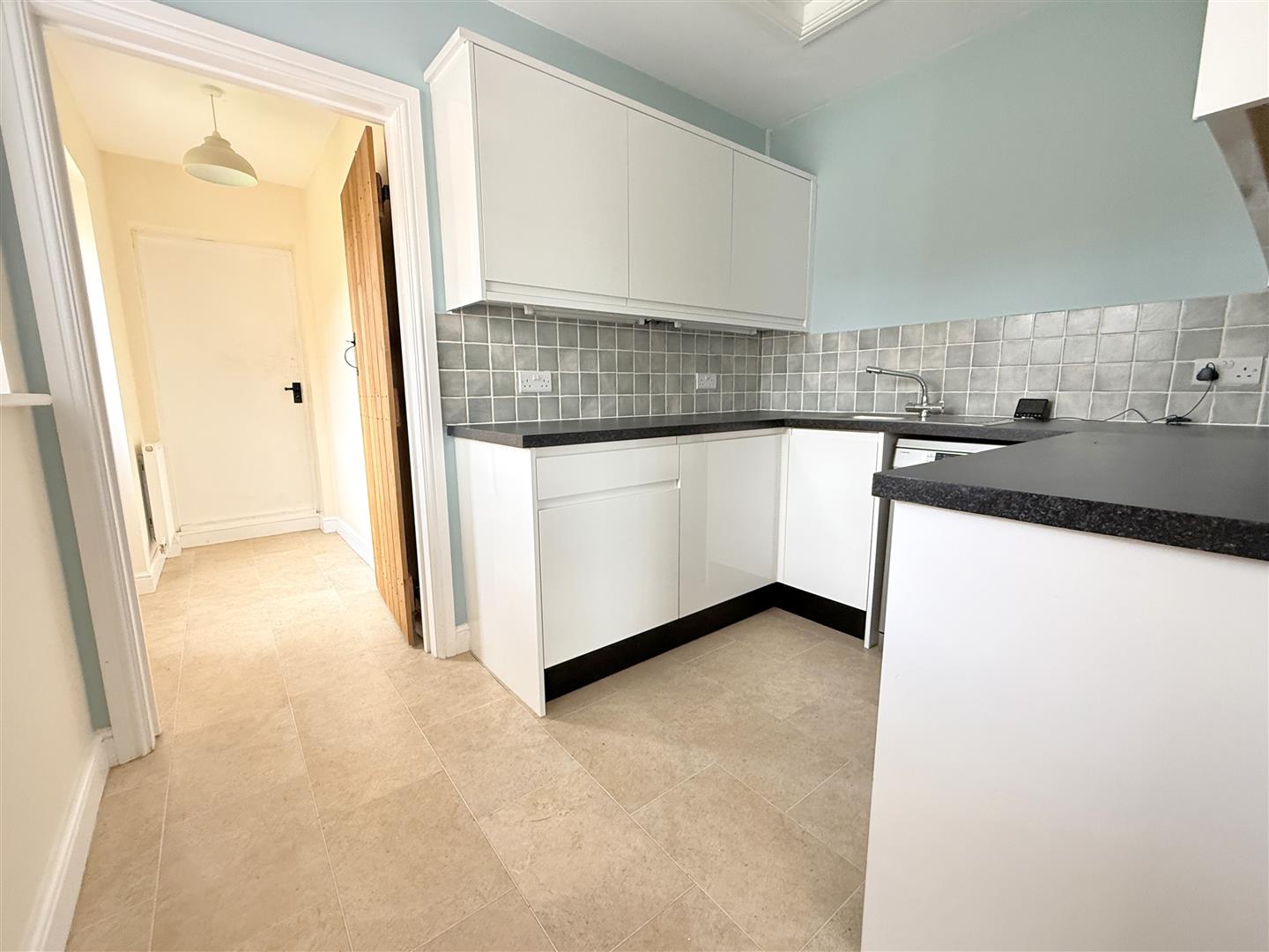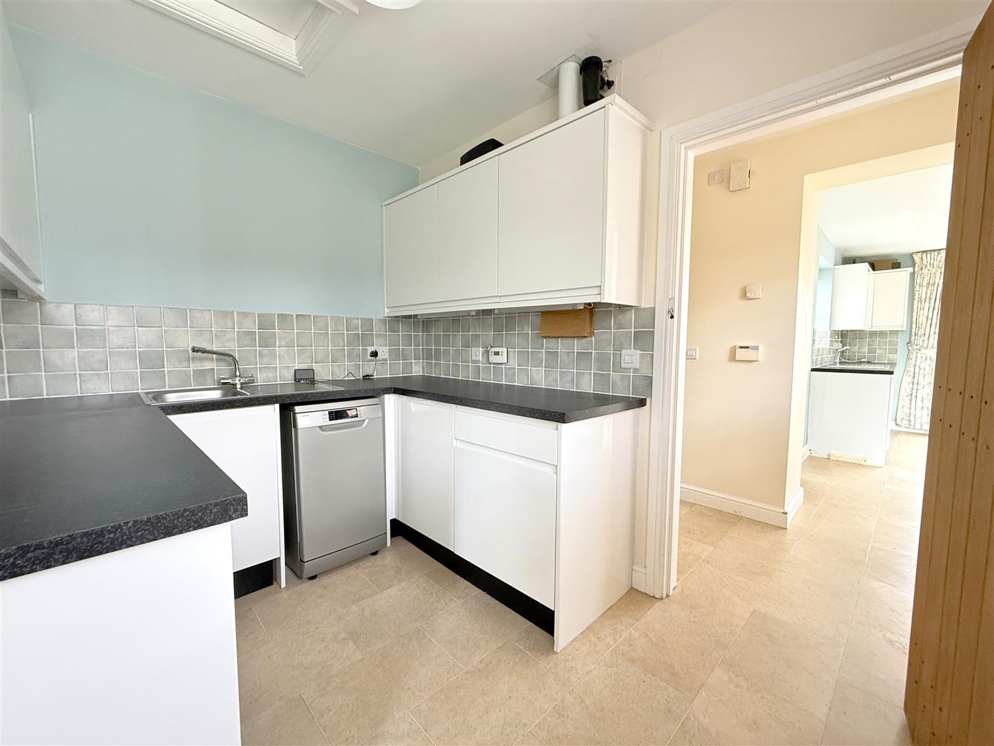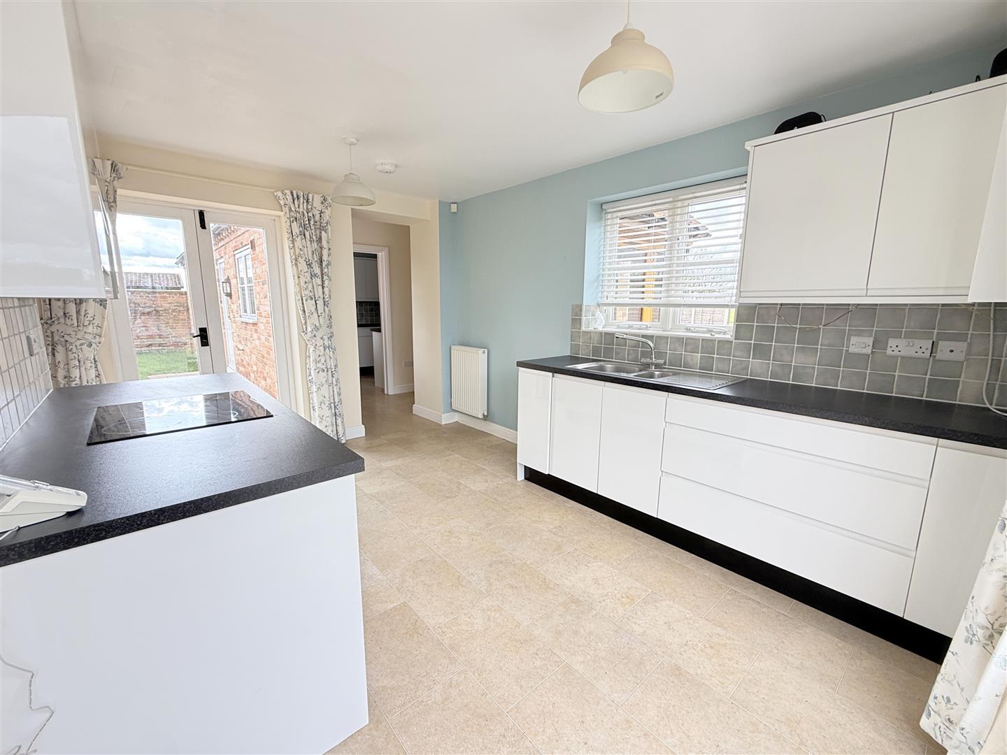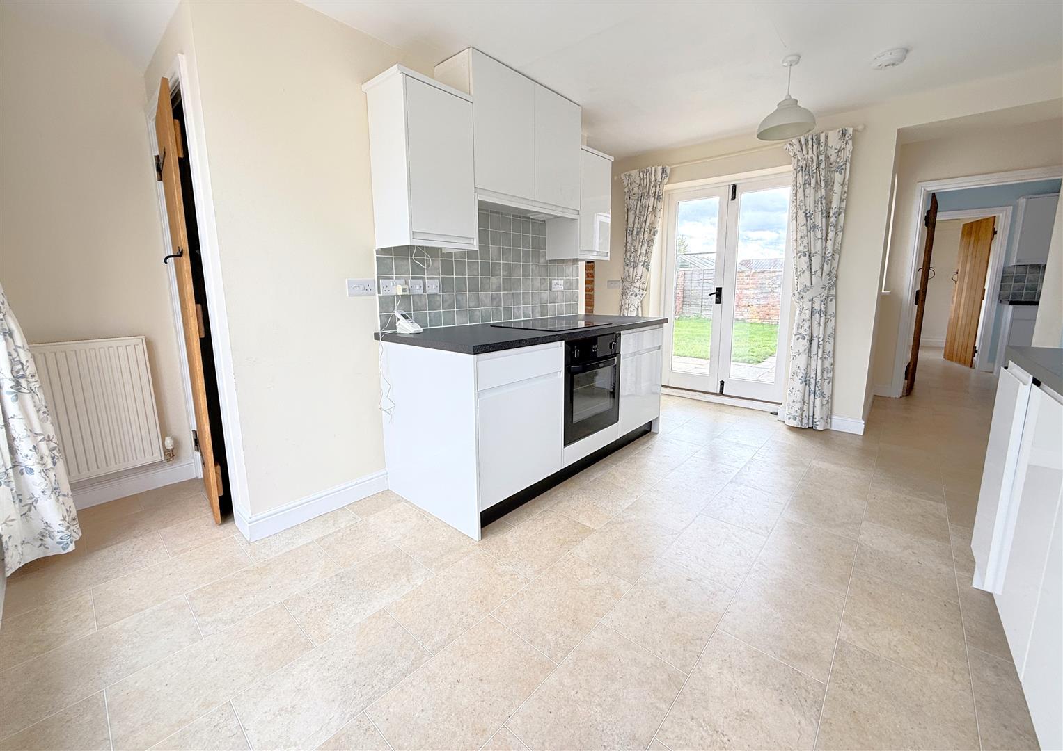 Kitchen - 4.24m x 3.00m min (13'11" x 9'10" min) - A light and airy space benefitting from double glazed windows to two elevations including an attractive arched, full height, window to the front and sealed unit double glazed French doors into the garden at the rear. The kitchen is appointed with a range of contemporary gloss fronted wall, base and drawer units providing a good level of storage with two runs of laminate preparation surfaces, one with inset stainless steel sink and drain unit with chrome mixer tap and tiled splash backs; integrated appliances include Hotpoint electric hob and single oven beneath; access to under stairs storage cupboard, an open doorway leading through into an initial stairwell with staircase rising to the first floor landing and a further cottage latch door leading throught into: