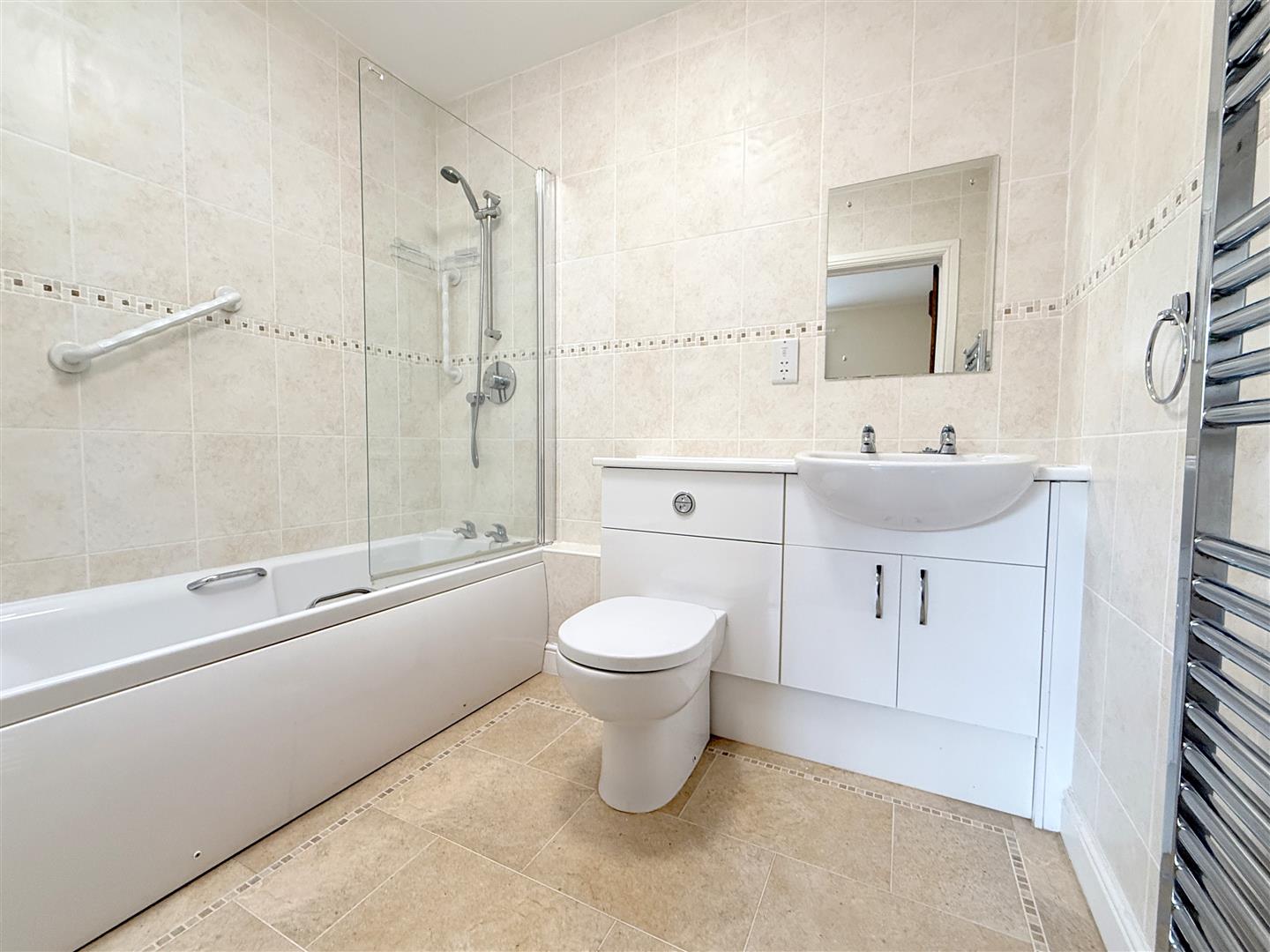 Ensuite Bathroom - 2.31m x 1.73m (7'7" x 5'8") - Having a three piece modern suite comprising panelled bath with chrome taps and a further wall mounted shower mixer with independent handset and glass screen, vanity area providing a built in storage cupboard, WC with concealed cistern and vanity surface over with inset washbasin with chrome taps; fully tiled walls with mosaic border inlay, shaver point, contemporary towel radiator and inset skylight to the ceiling.