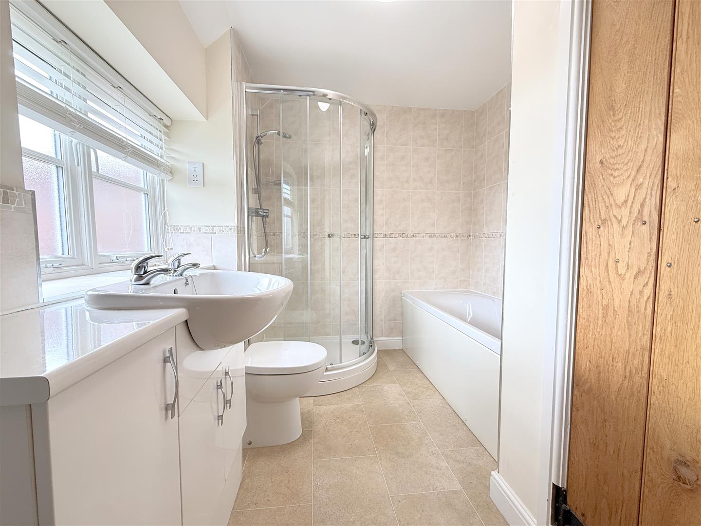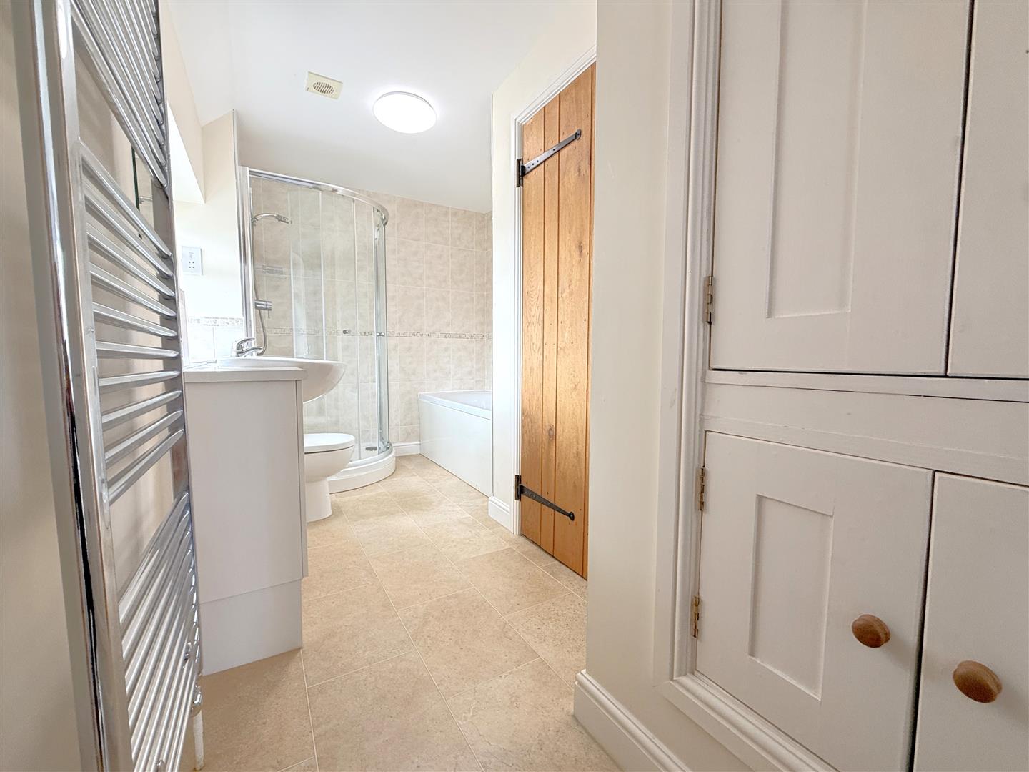 Ensuite Shower/Bath Room - 4.04m x 2.06m max (13'3" x 6'9" max) - An L shaped room having a contemporary suite comprising panelled bath with chrome taps, separate quadrant shower enclosure with curved sliding double doors and wall mounted shower mixer, close coupled WC and vanity unit with inset washbasin with chrome taps and tiled splash backs; built in airing cupboard housing the pressurised hot water system, separate built in over stairs cupboard, contemporary towel radiator, exposed brick pier, shaver point and double glazed window to the rear.