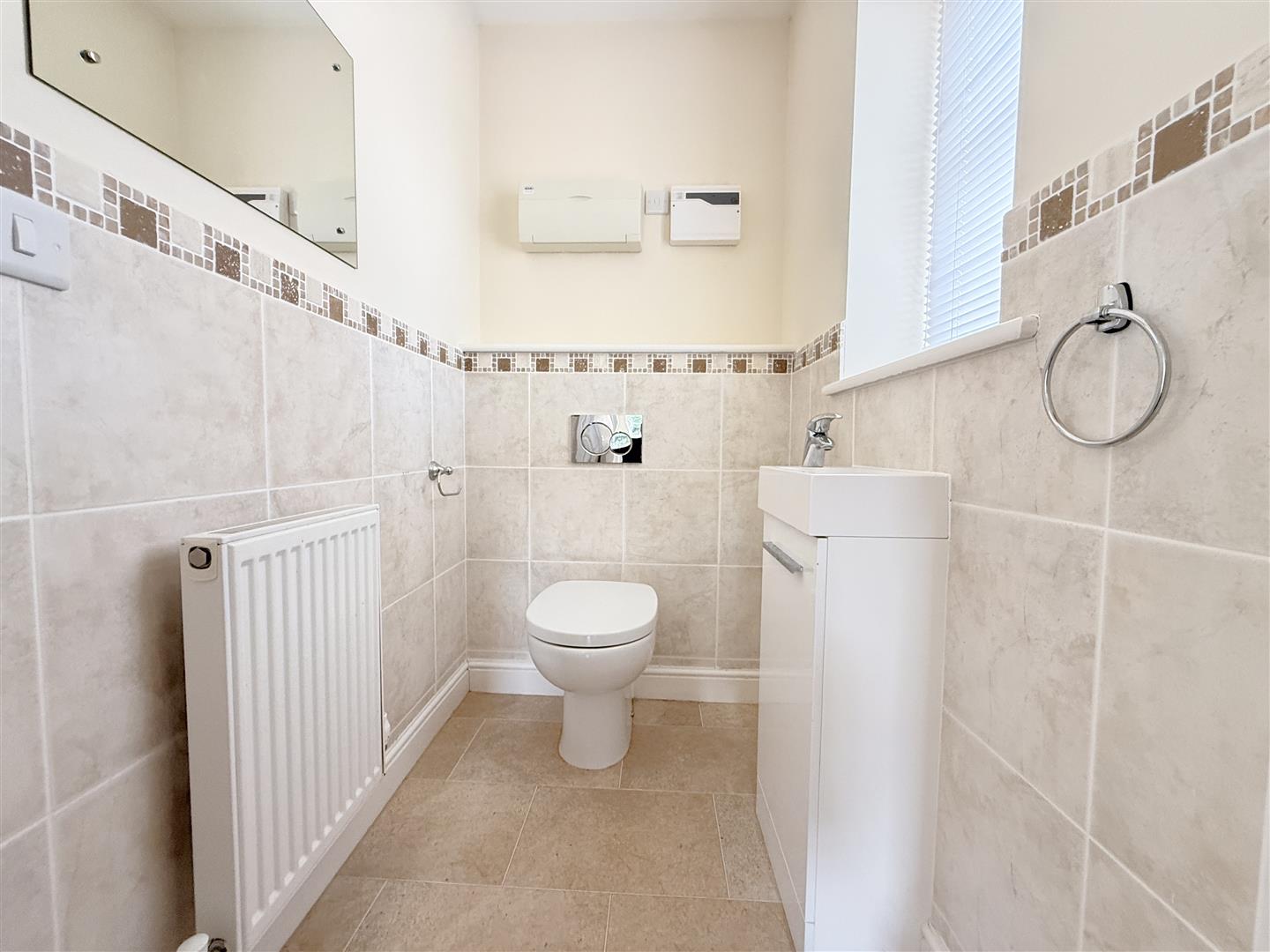 Ground Floor Cloak Room - 1.47m x 1.12m (4'10" x 3'8") - Having a two piece suite comprising WC with concealed cistern and vanity unit with inset washbasin with chrome mixer tap and tiled splash back with stone mosaic border over; wall mounted consumer unit and double glazed window to the front.