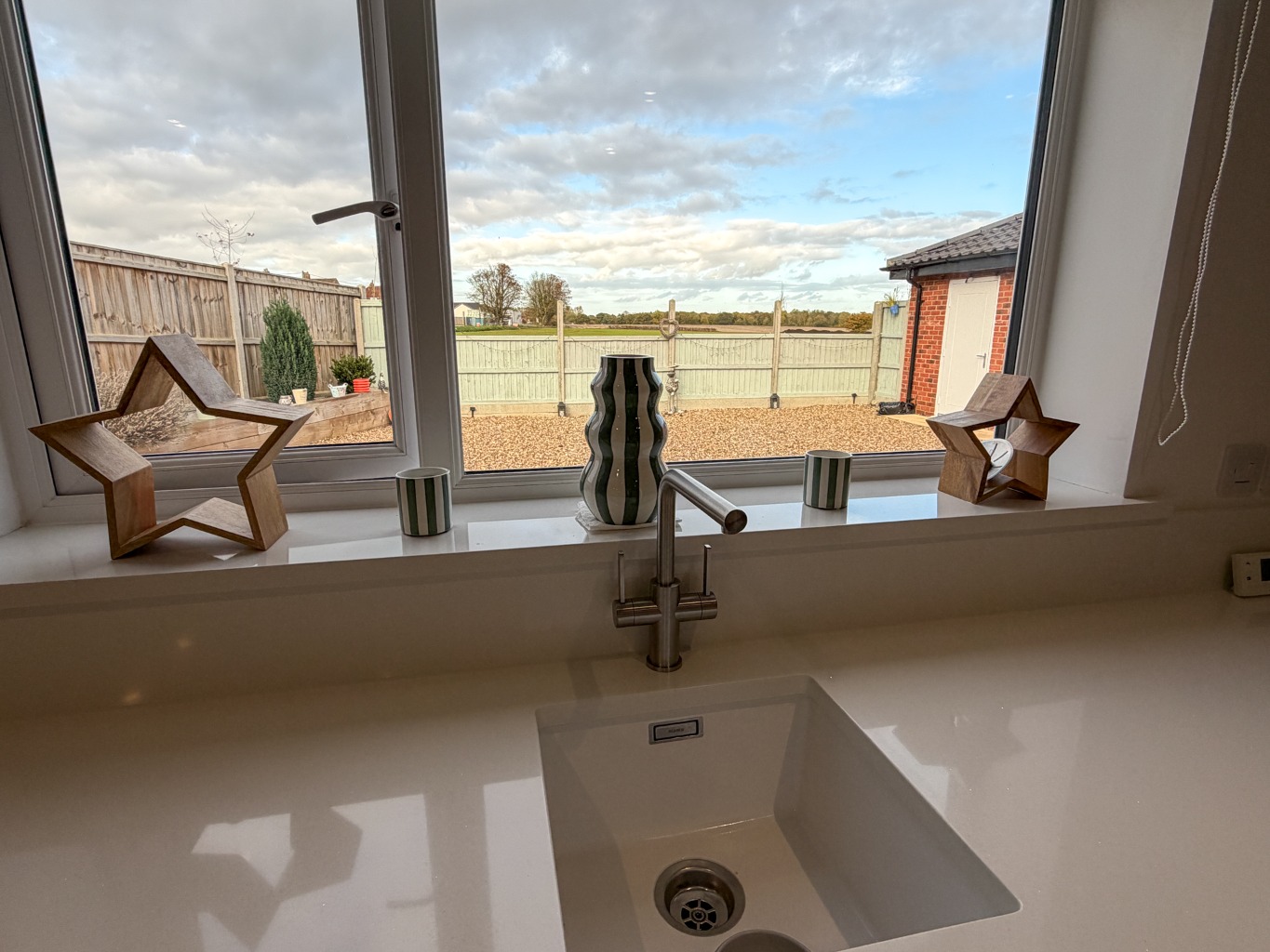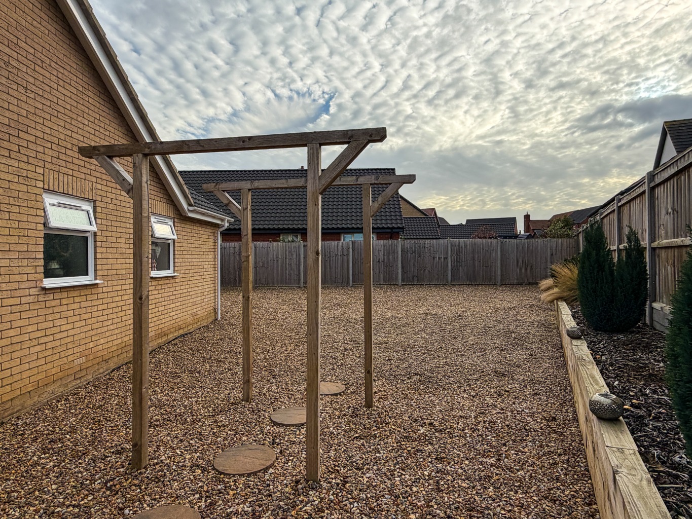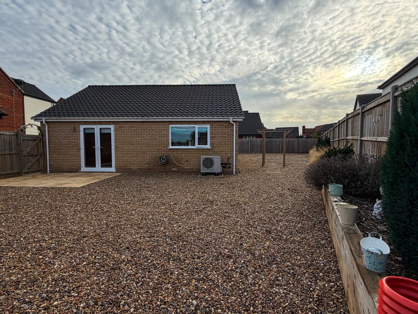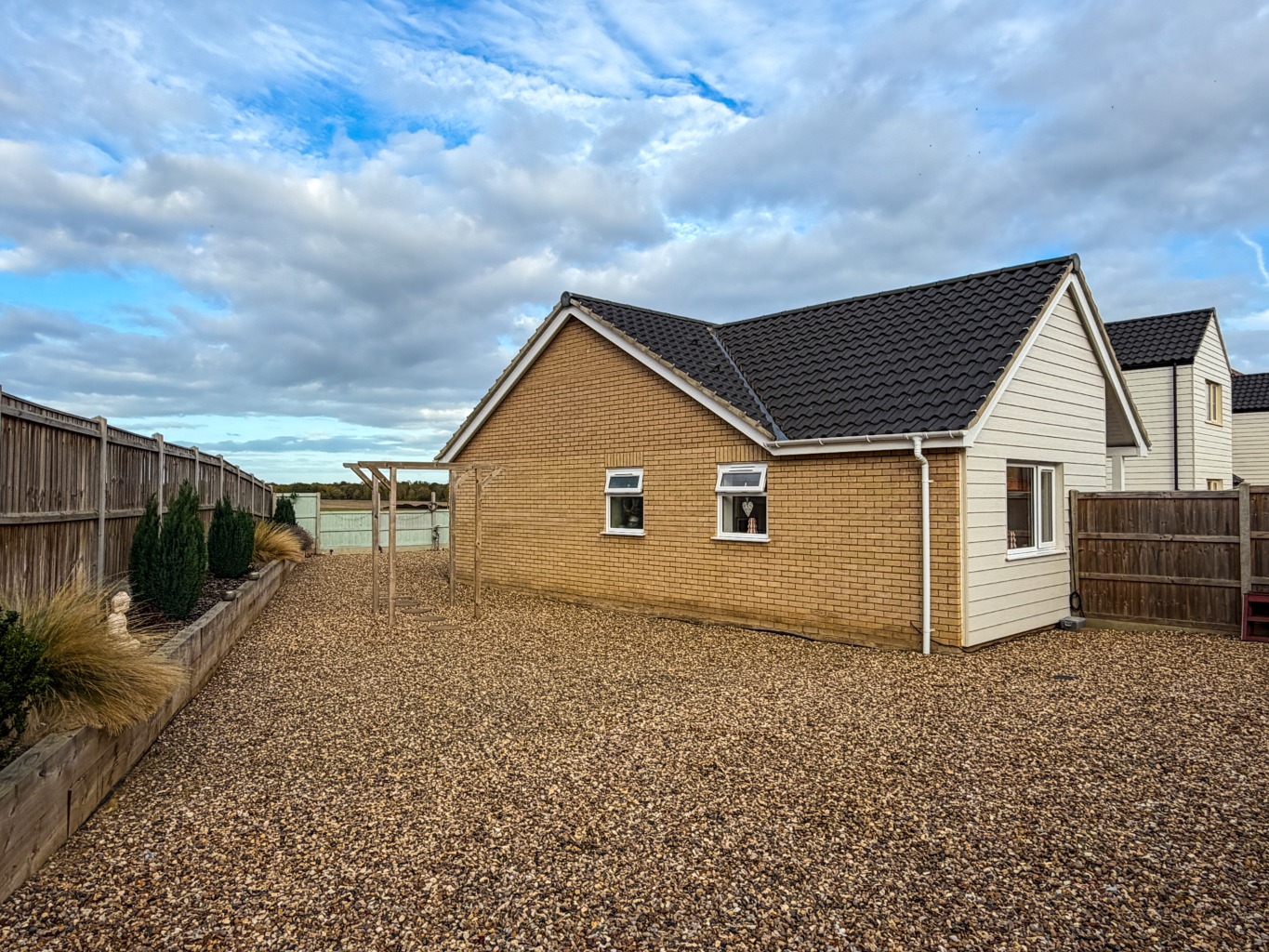 - Low Maintenance Shingle Side & Rear Gardens, Enclosed by Fencing with Patio Seating Terrace and Raised Planting Boxes