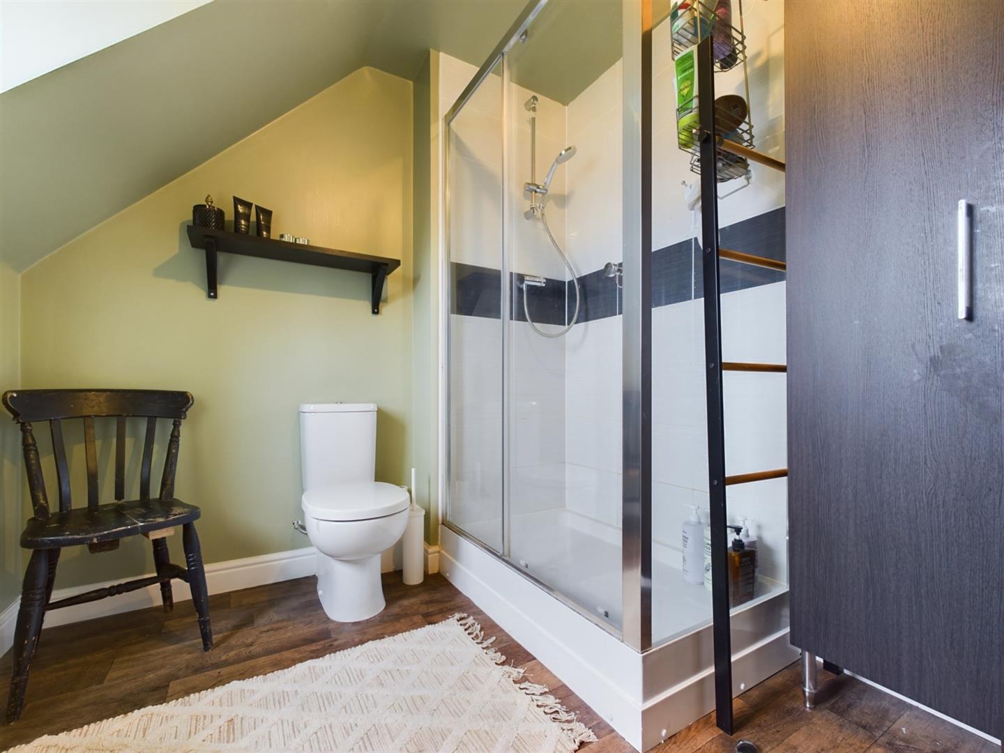 EN SUITE - Enclosed shower cubicle, pedestal hand wash basin, WC, radiator.