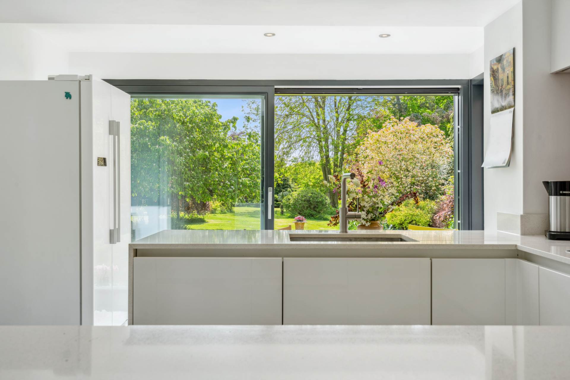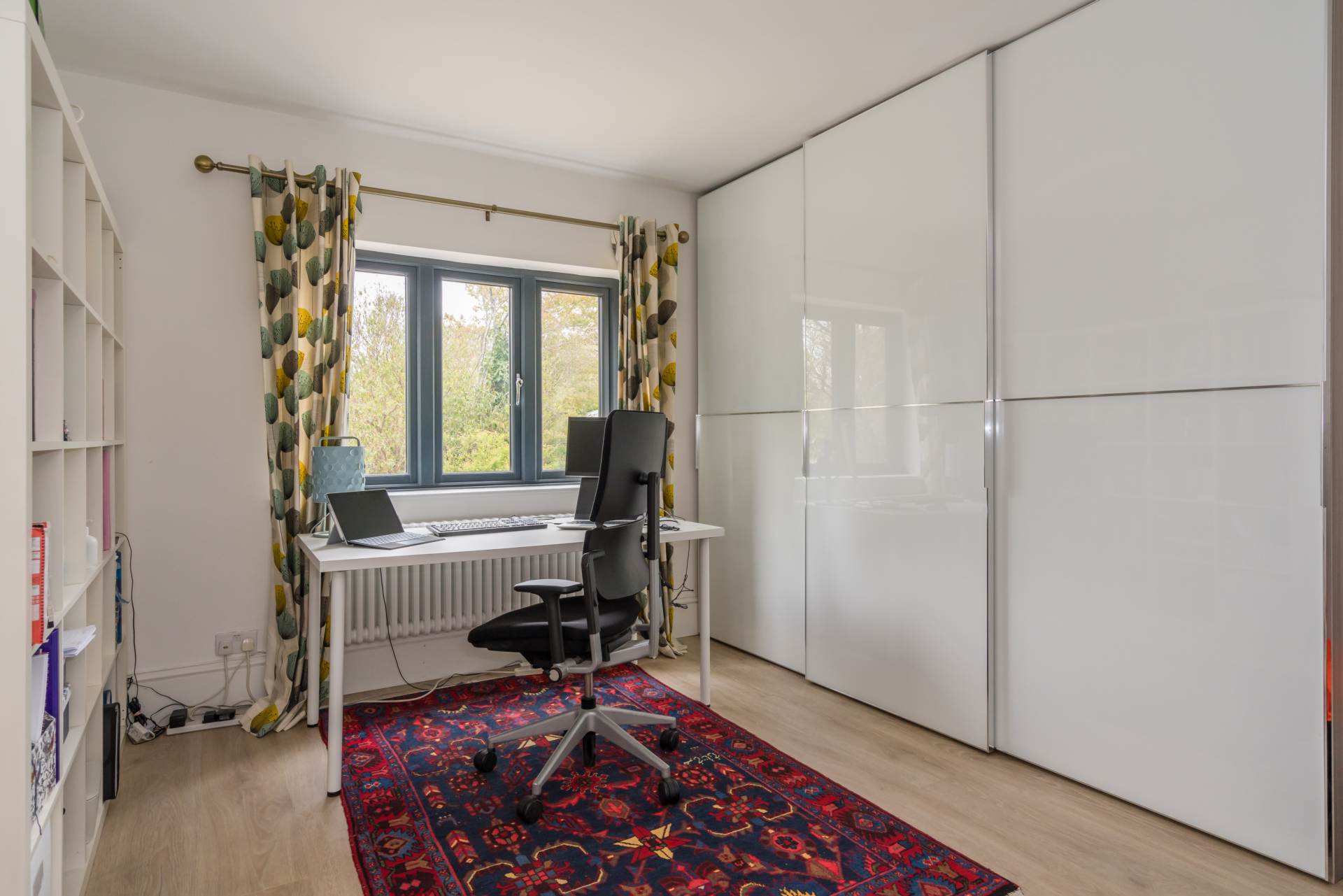 The entrance hall sets the tone with its warm wooden flooring and stylish feature radiator. The contemporary kitchen is bright and sociable, with space for a breakfast table and seamless access to the outdoors via sliding glass doors perfect for indoor-outdoor living and entertaining.