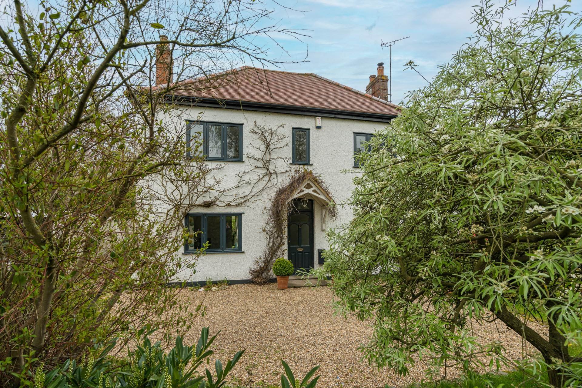 The home is approached by a private gravel driveway, framed by well-kept lawns and mature trees, offering parking for multiple vehicles and access to a tandem garage and workshop. The front garden is richly planted with a variety of shrubs and flowers a testament to the care of the current owners.