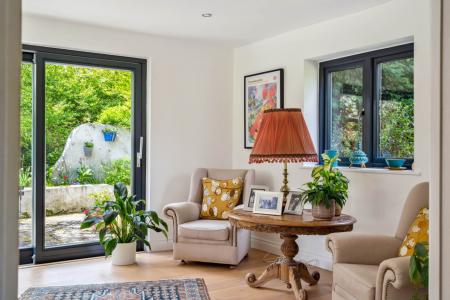 The spacious sitting room enjoys triple-aspect views and direct garden access, featuring a cosy multi-fuel burner for winter evenings. Additional ground floor rooms include a separate dining room, a flexible study/snug, a shower room, and a conservatory ideal as a playroom or further living space.
