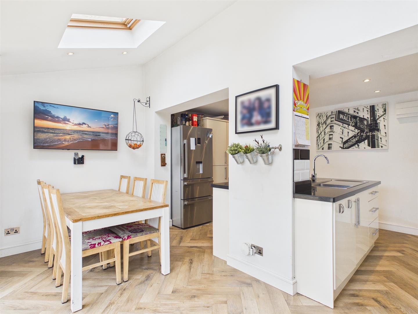 To the rear, the heart of the home is the kitchen/diner. This generous space features a central island with sink and space for a cooker, along with designated areas for a washing machine and an American-style fridge freezer. There is ample room for a dining table and a comfortable seating area, making it perfect for both everyday living and entertaining. Doors open directly onto the rear garden, allowing for a seamless indoor-outdoor flow.