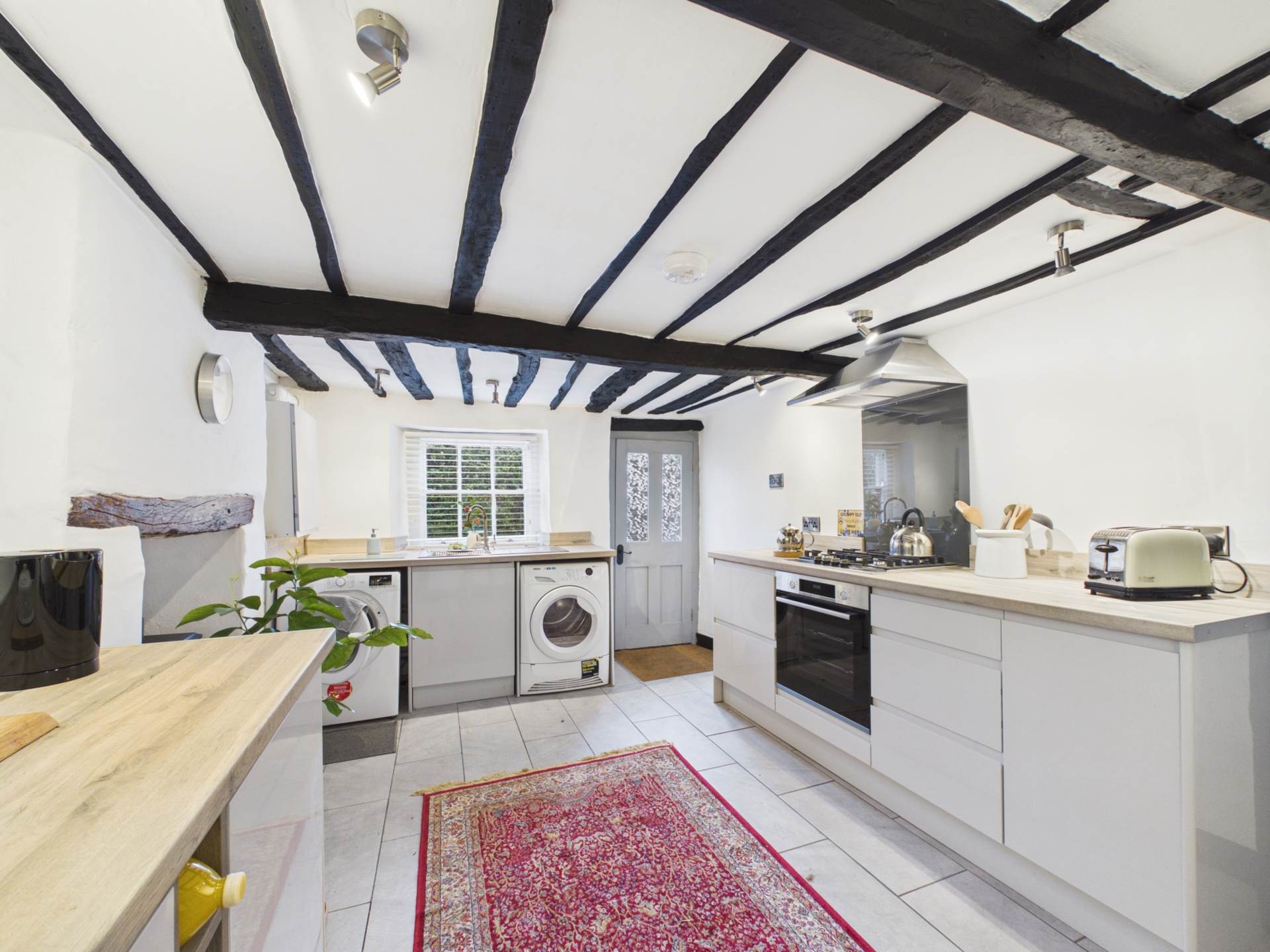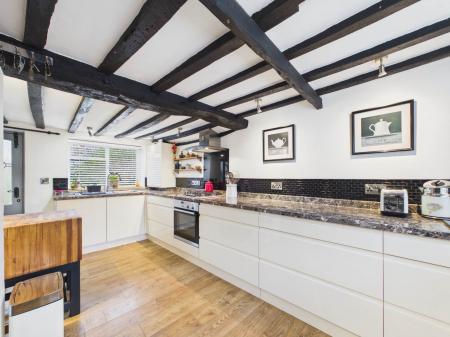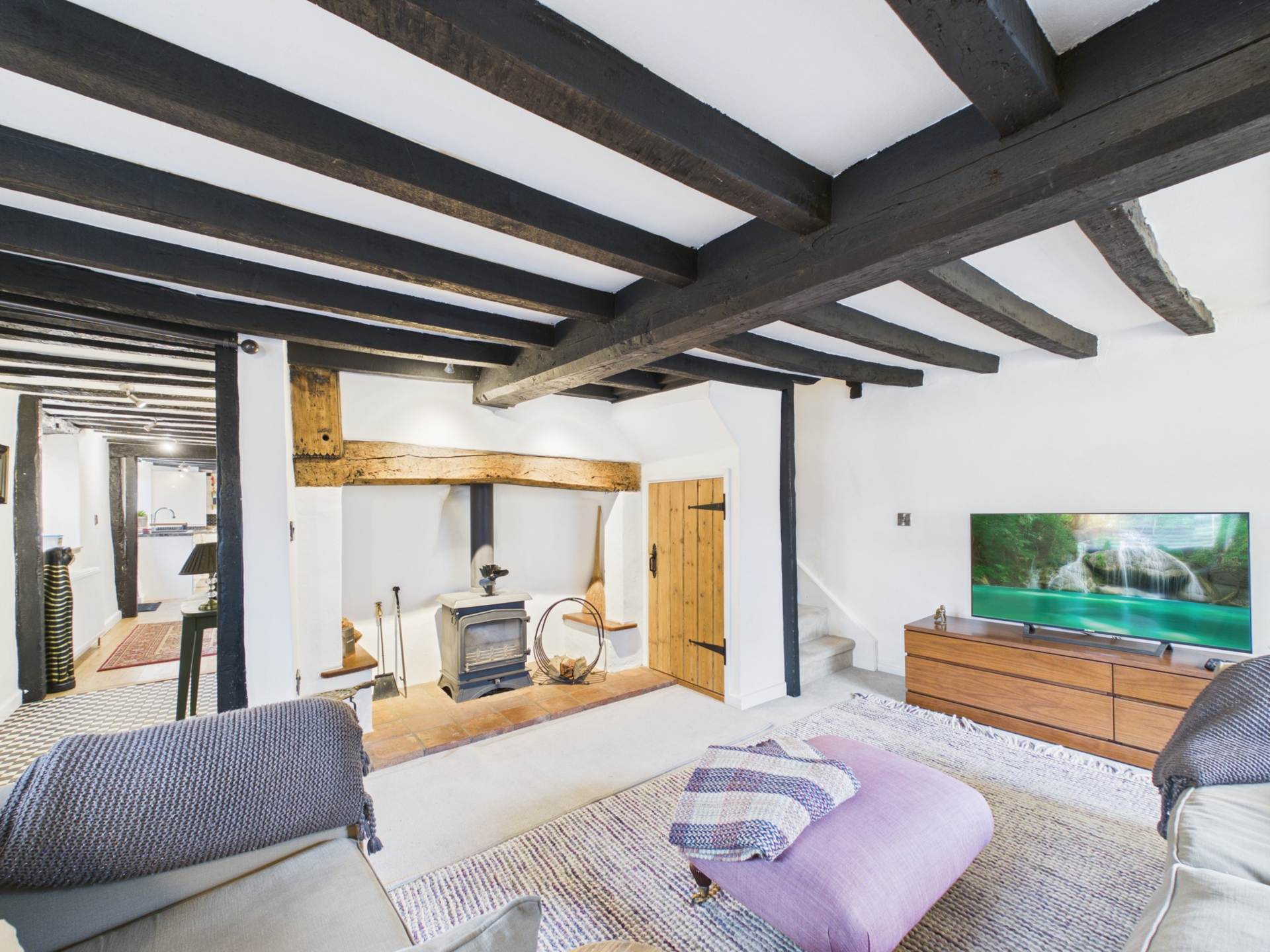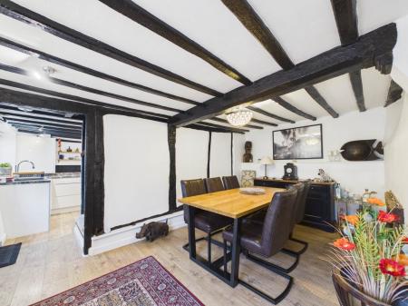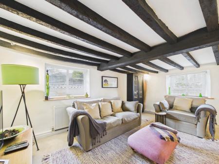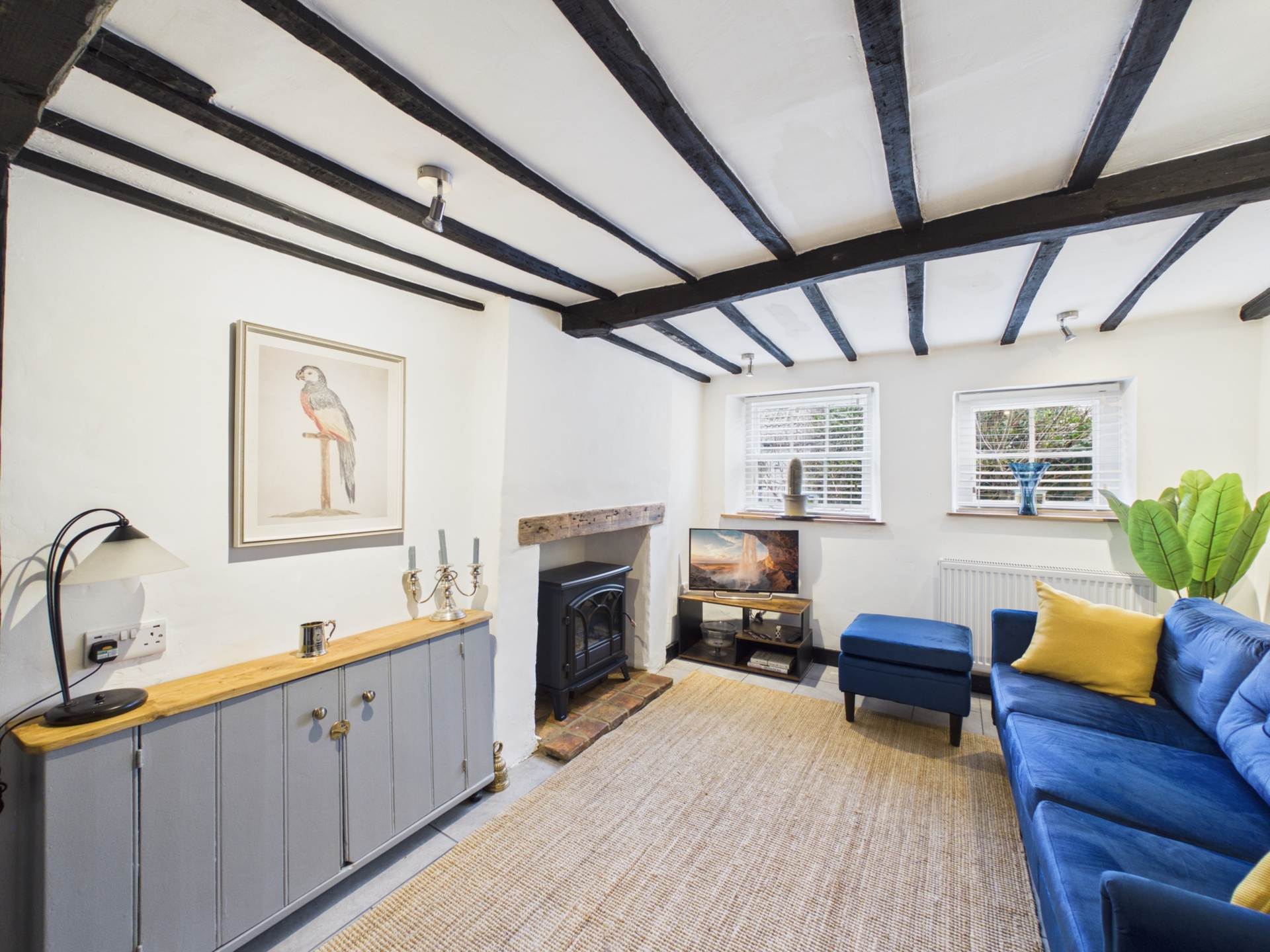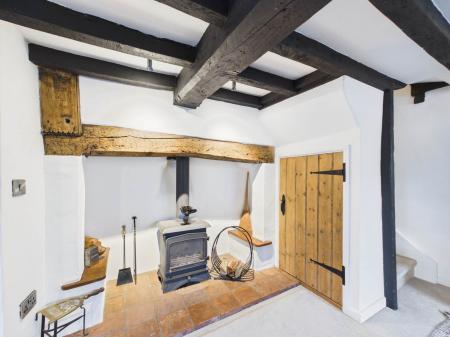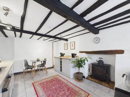 The welcoming entrance hall leads into a well-equipped kitchen with gas hob and ample storage, flowing effortlessly into a formal dining room with exposed beams and original details. The cosy living room features a log-burning stove, creating a warm and inviting focal point.