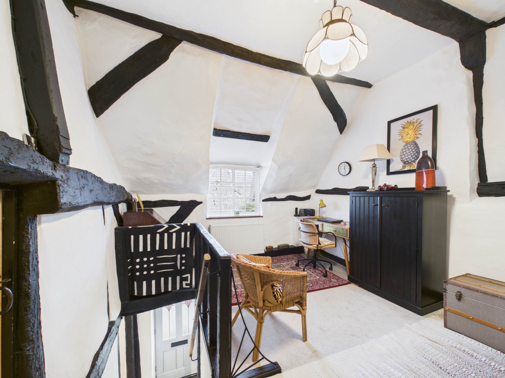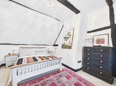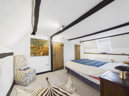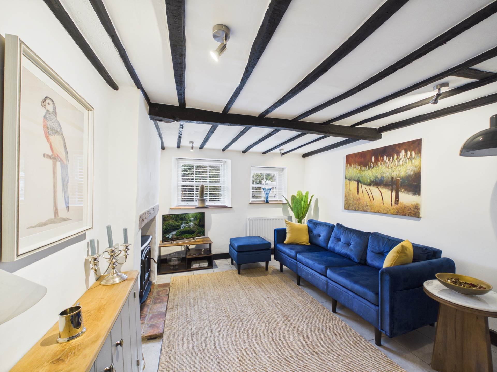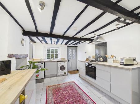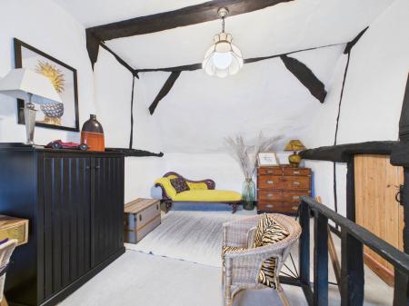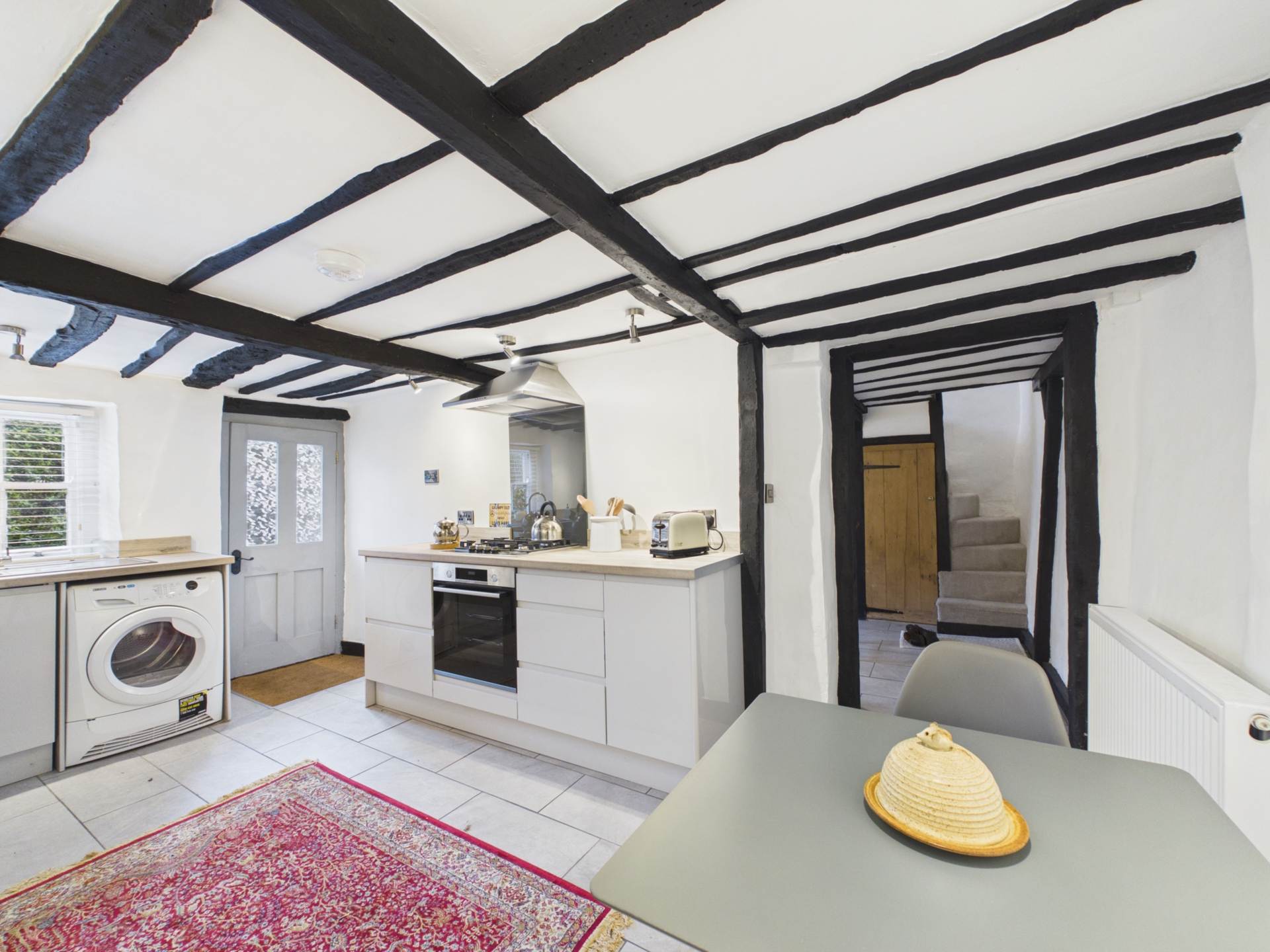 The welcoming entrance hall leads into a well-equipped kitchen with gas hob and ample storage, flowing effortlessly into a formal dining room with exposed beams and original details. The cosy living room features a log-burning stove, creating a warm and inviting focal point.