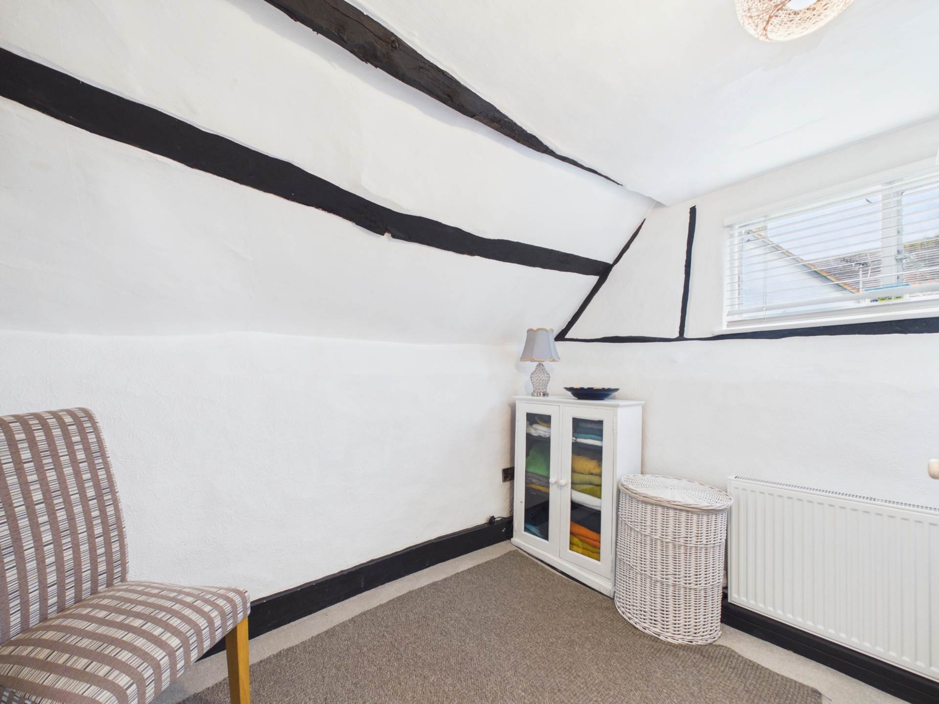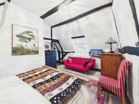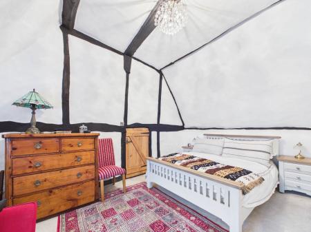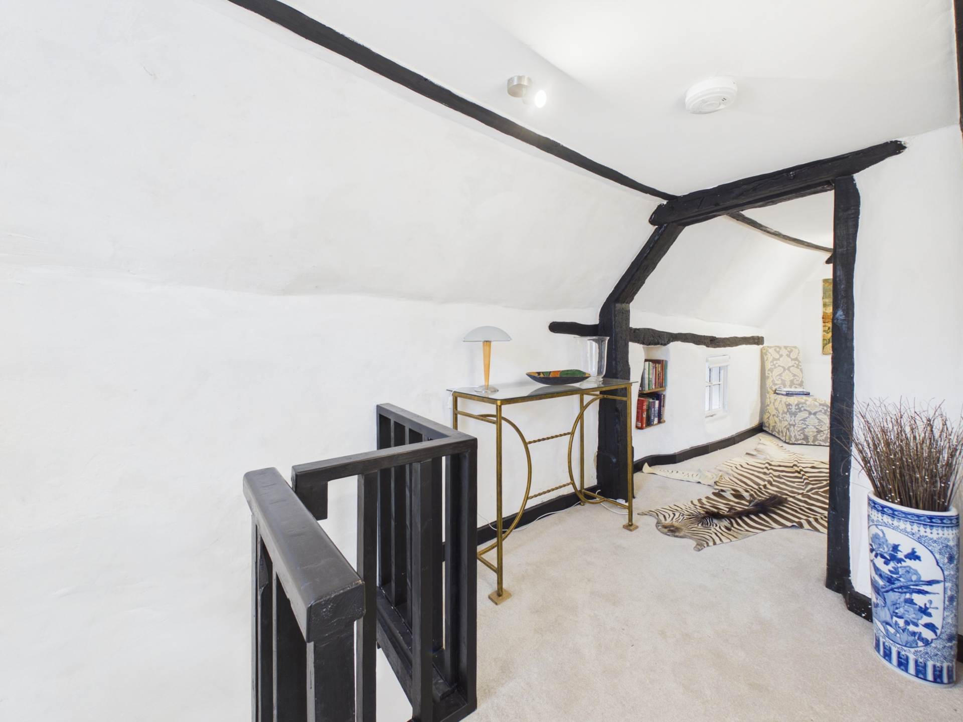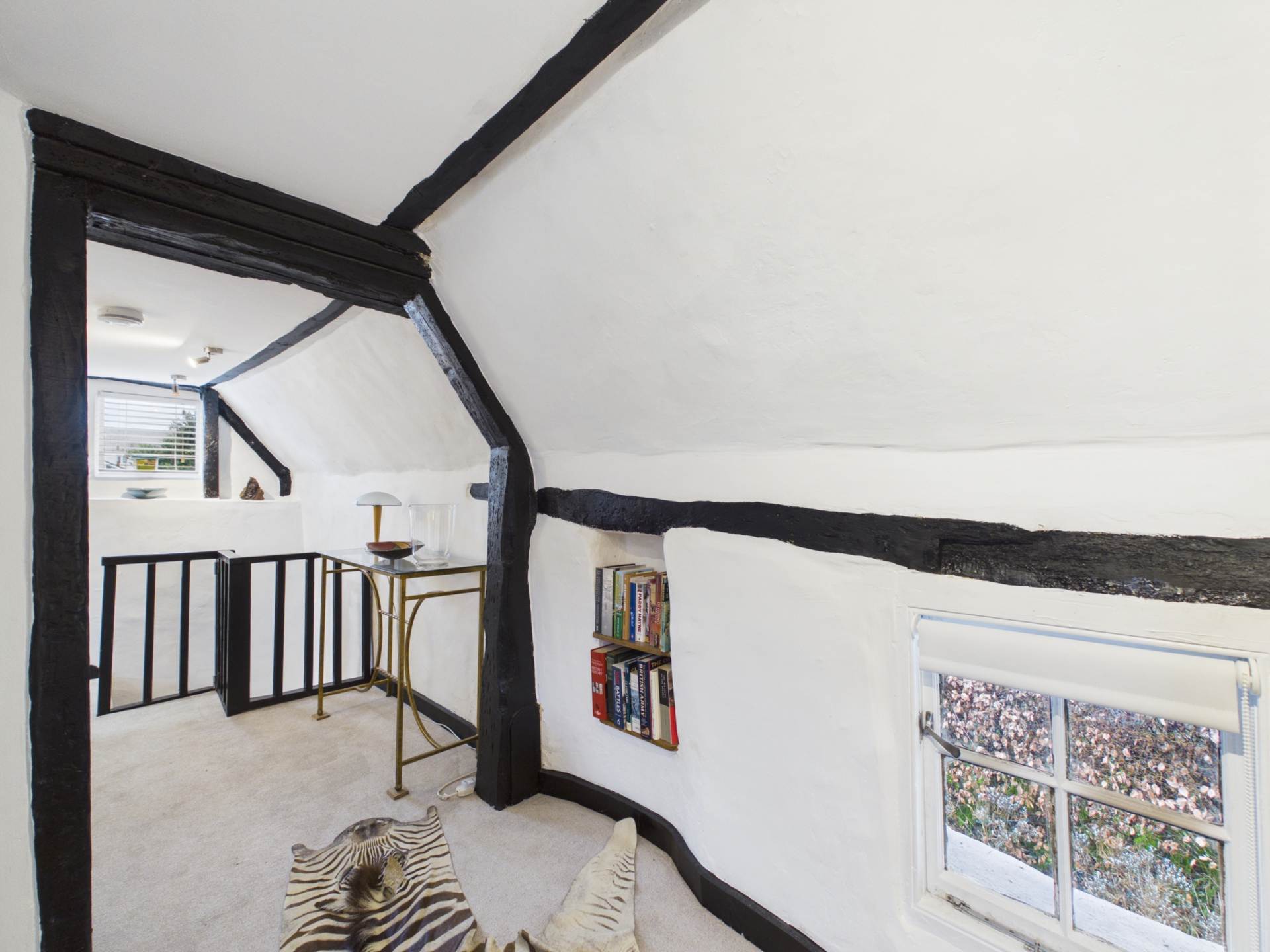 The welcoming entrance hall leads into a well-equipped kitchen with gas hob and ample storage, flowing effortlessly into a formal dining room with exposed beams and original details. The cosy living room features a log-burning stove, creating a warm and inviting focal point.