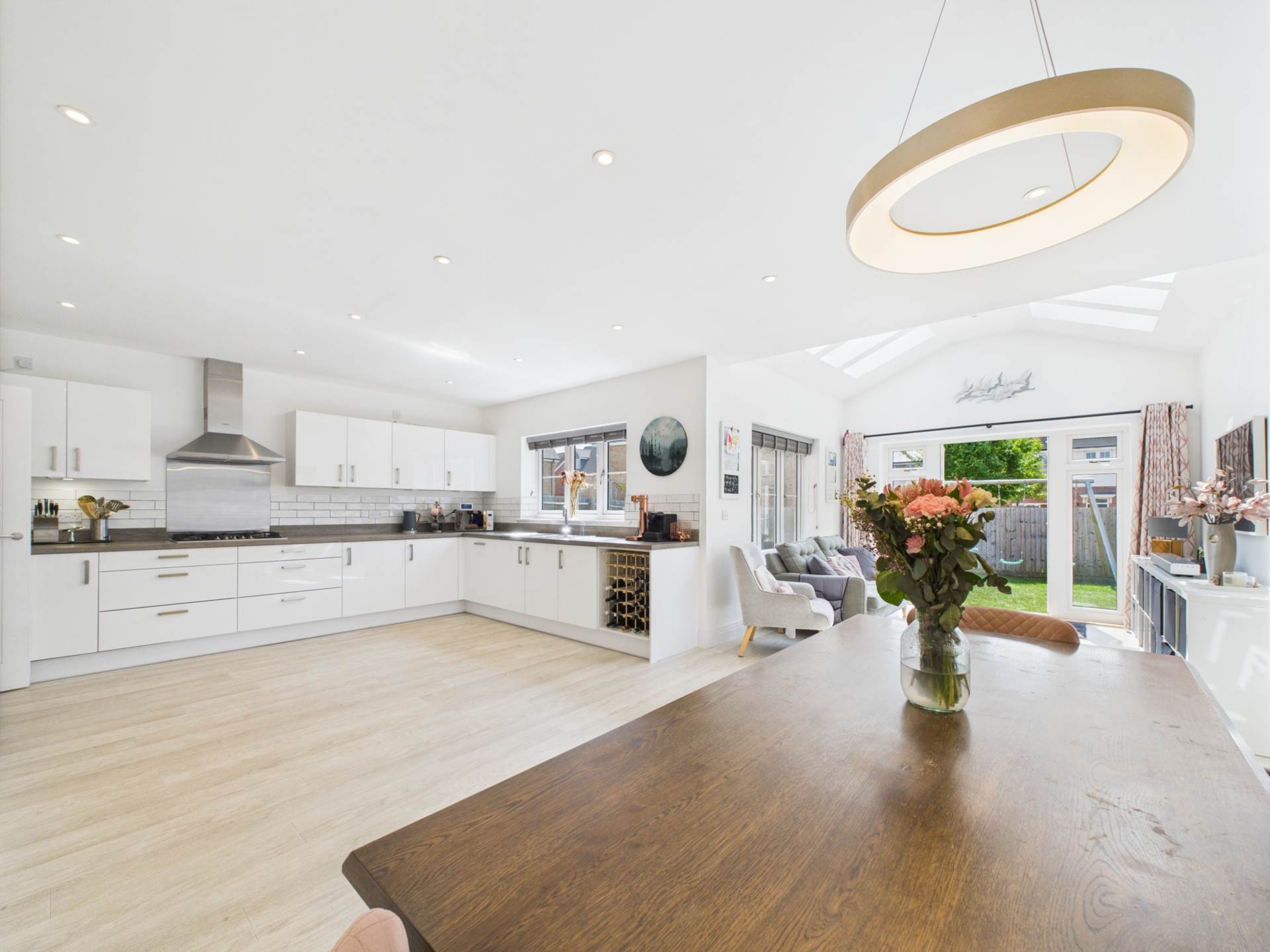Kitchen area leads into a vaulted Dining area/Family space, filled with natural light and offering a seamless connection to the garden perfect for entertaining or relaxed family time.