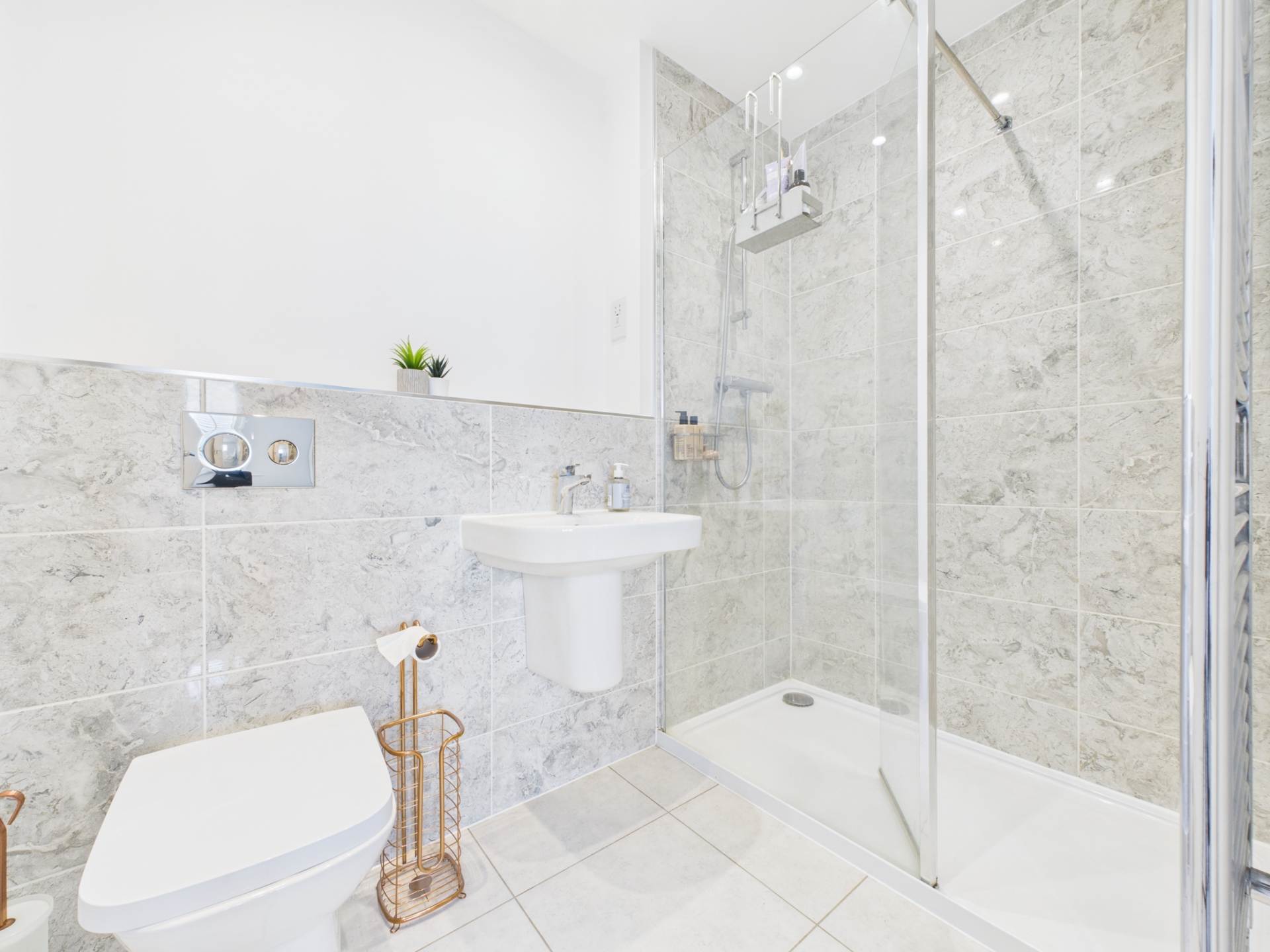Principal bedroom suite with walk-in dressing room and modern en-suite bathroom, currently holding a super-king bed