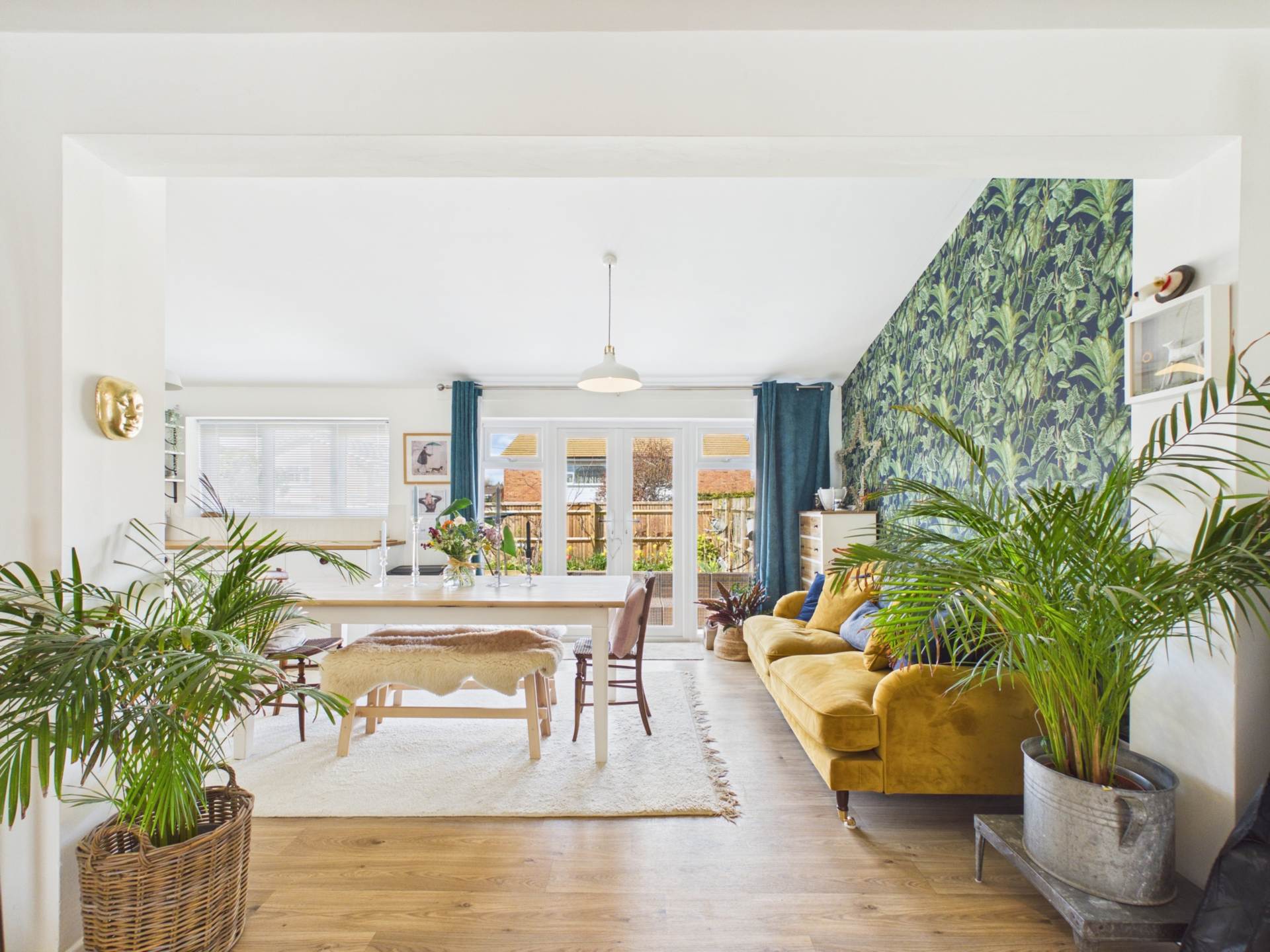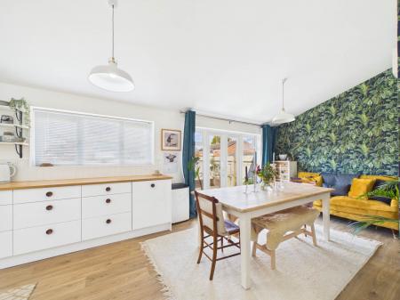 Internally, the property features a spacious, light-filled reception room with recently refurbished solid oak flooring, which flows seamlessly into an open-plan kitchen and dining area. The kitchen is fitted with integrated Neff appliances, including a hob, hide-and-slide oven, combi microwave, and warming drawer. A Velux window floods the space with natural light, complementing the ample storage and wooden worktops. From here, there is direct access to the garden, as well as entry to a small lobby providing secondary garden and garage access.