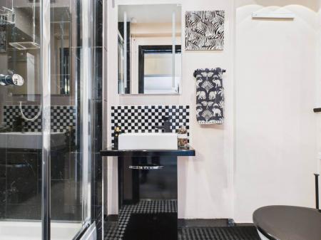 family. The spacious and stylish family bathroom includes a walk-in shower, WC, and washbasin.
