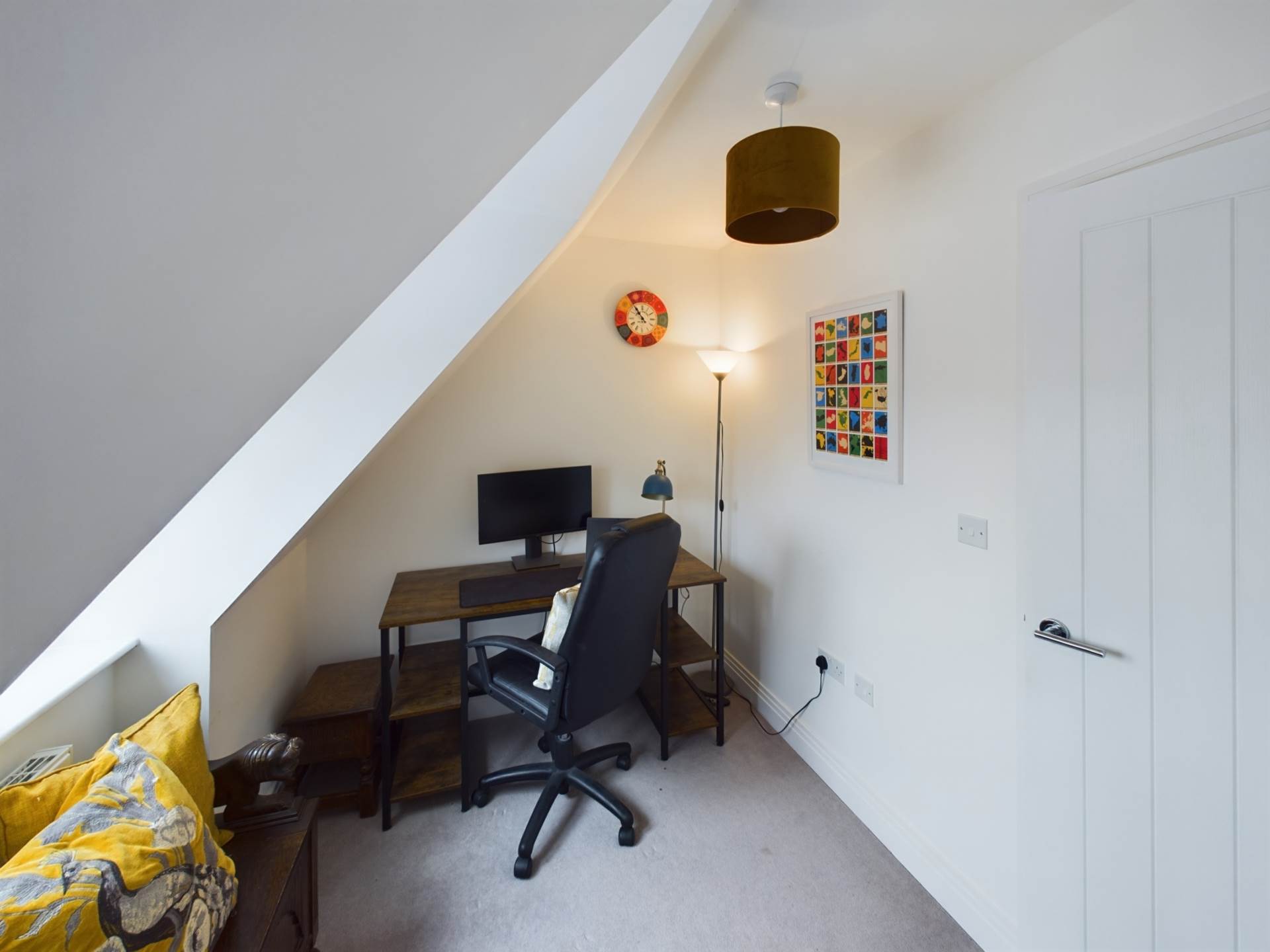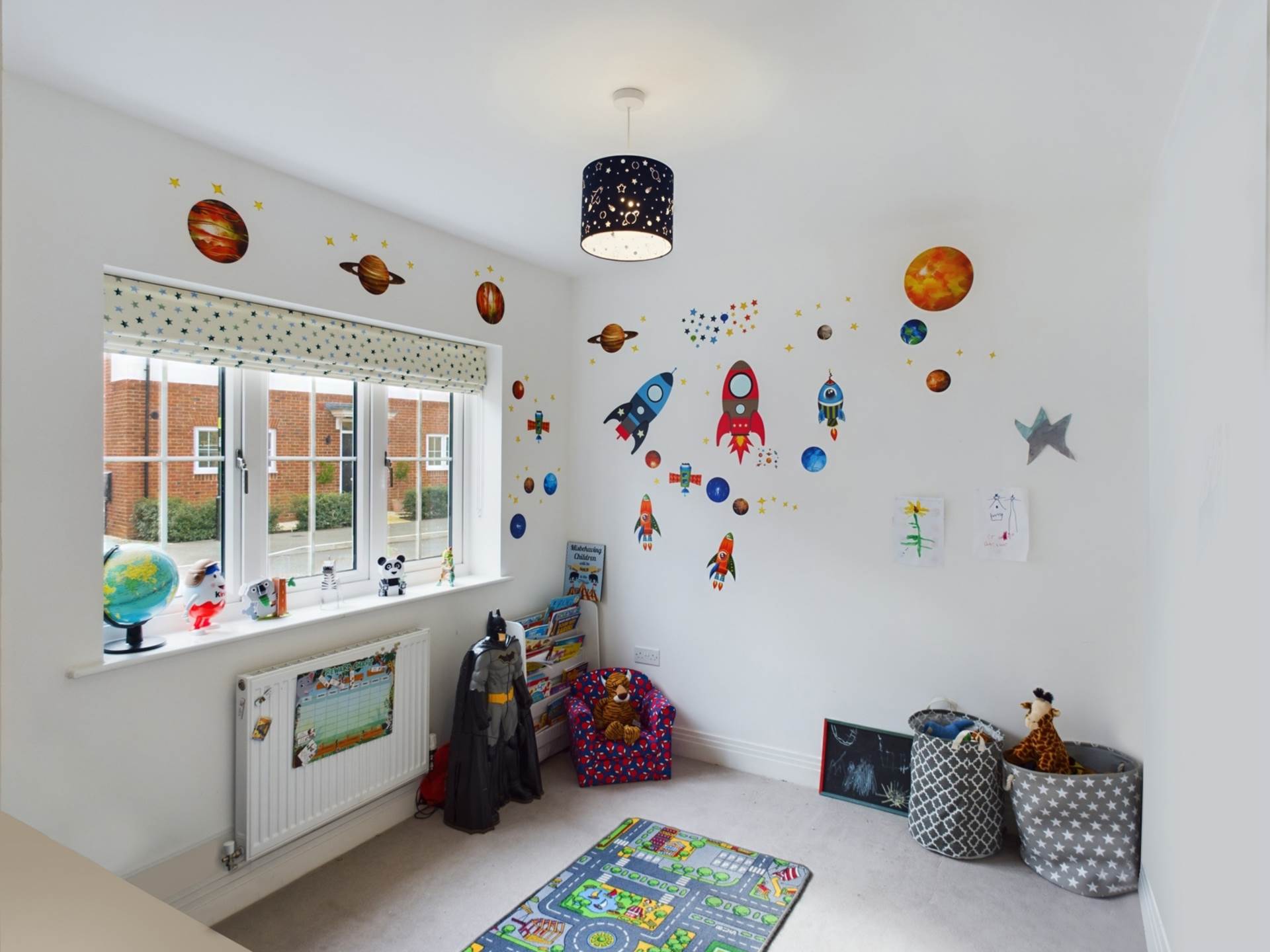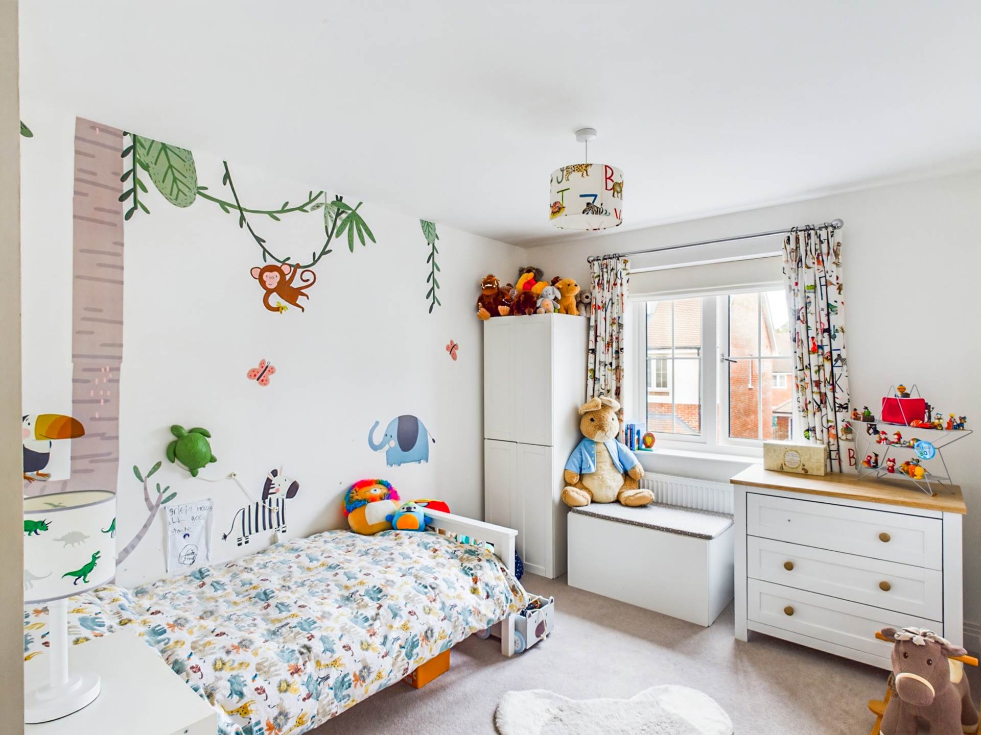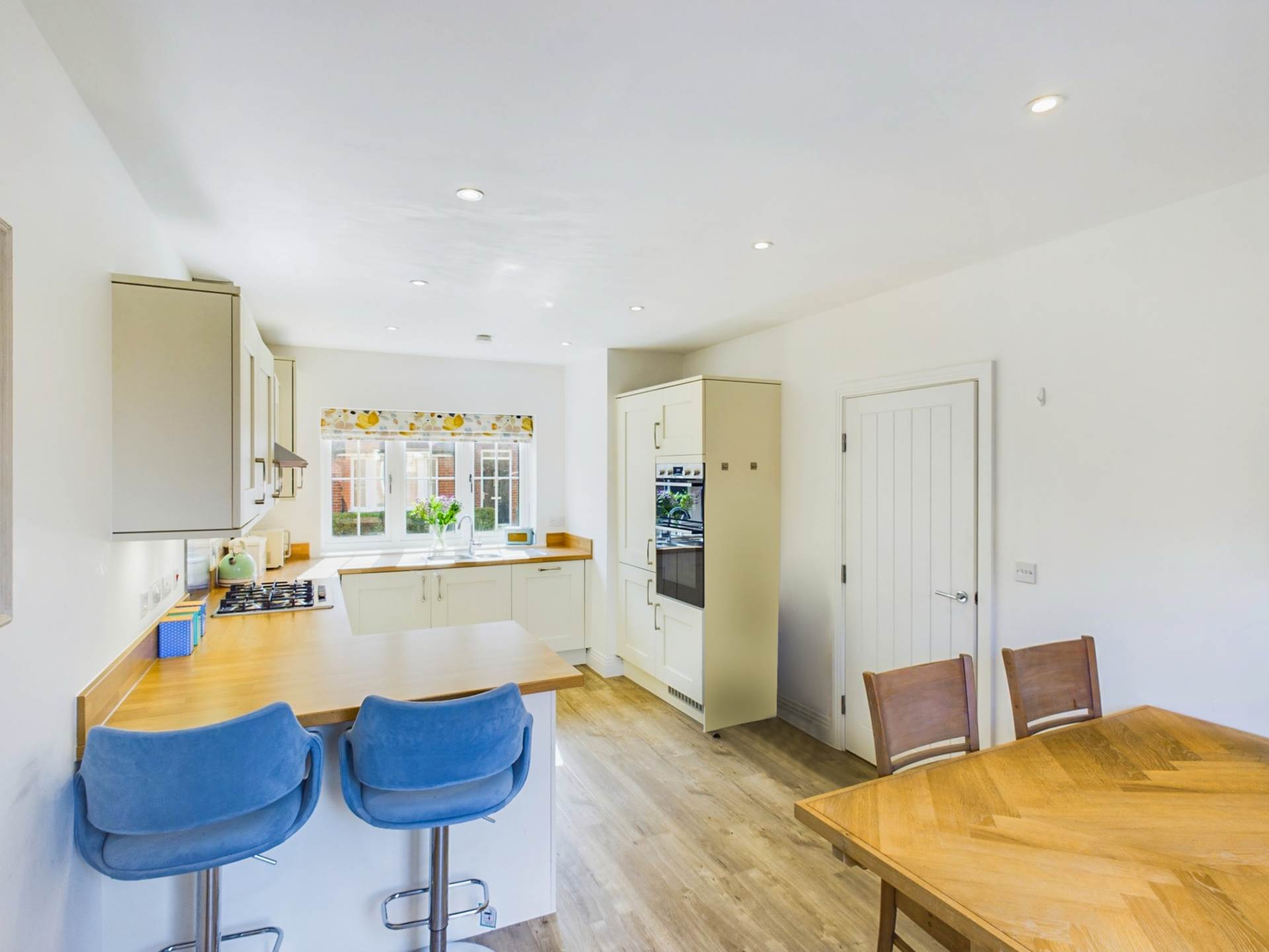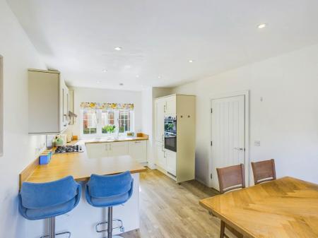The ground floor offers a spacious sitting room with dual aspect windows to the side and rear, with French doors leading to the garden. The light-filled kitchen is equipped with a comprehensive range of wall and base units, integrated appliances, and a breakfast bar, with ample space for both dining and family areas. Additionally, a versatile playroom or study and a convenient cloakroom complete this floor.