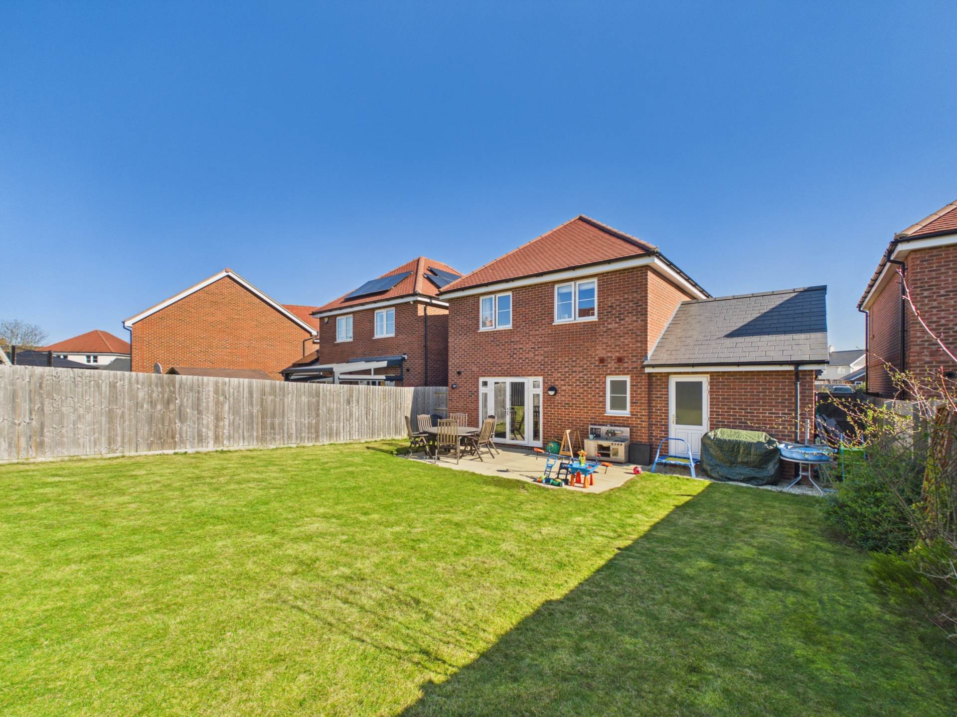 Externally, the rear garden is a true suntrap laid to lawn with a patioed seating area, tranquil, and ideal for relaxing or hosting guests.