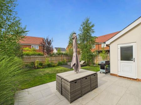Externally, the landscaped rear garden is bordered by well-maintained plants and includes a separate raised suntrap seating area ideal for enjoying warm summer days. Additional benefits include a single garage, off-street parking, and a superb position overlooking the green and children`s play area, offering an open and scenic outlook.