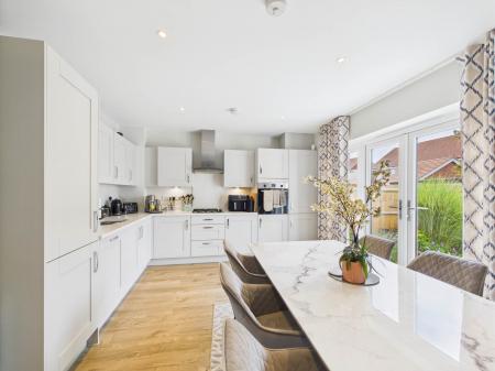 This stunning property offers a spacious and thoughtfully designed layout, beginning with a welcoming entrance hall that leads into a front-aspect reception room, perfect for relaxing or entertaining. To the rear, the stylish kitchen/breakfast room features integrated appliances, a gas hob, and ample dining space, with patio doors opening directly onto the landscaped rear garden. Adjacent to the kitchen, you`ll find a convenient utility area, a downstairs WC, and internal access to the garage.