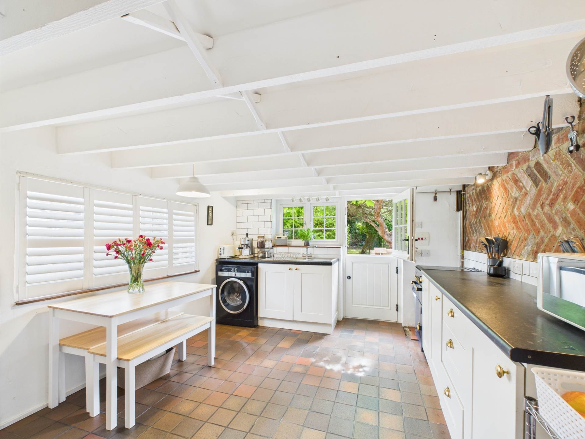 The kitchen and dining room, part of the later extension, is generously proportioned with rustic beams, quarry-tiled flooring, and ample space for family dining or entertaining.