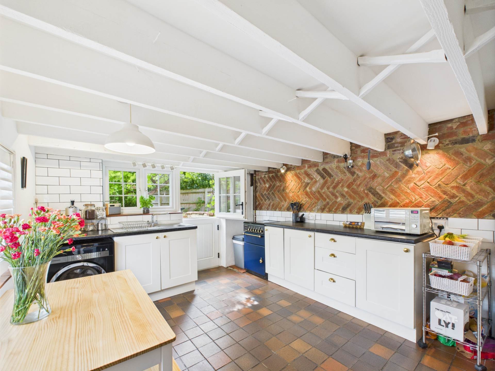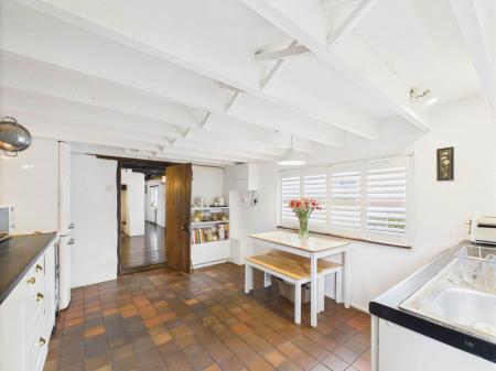 The kitchen and dining room, part of the later extension, is generously proportioned with rustic beams, quarry-tiled flooring, and ample space for family dining or entertaining.