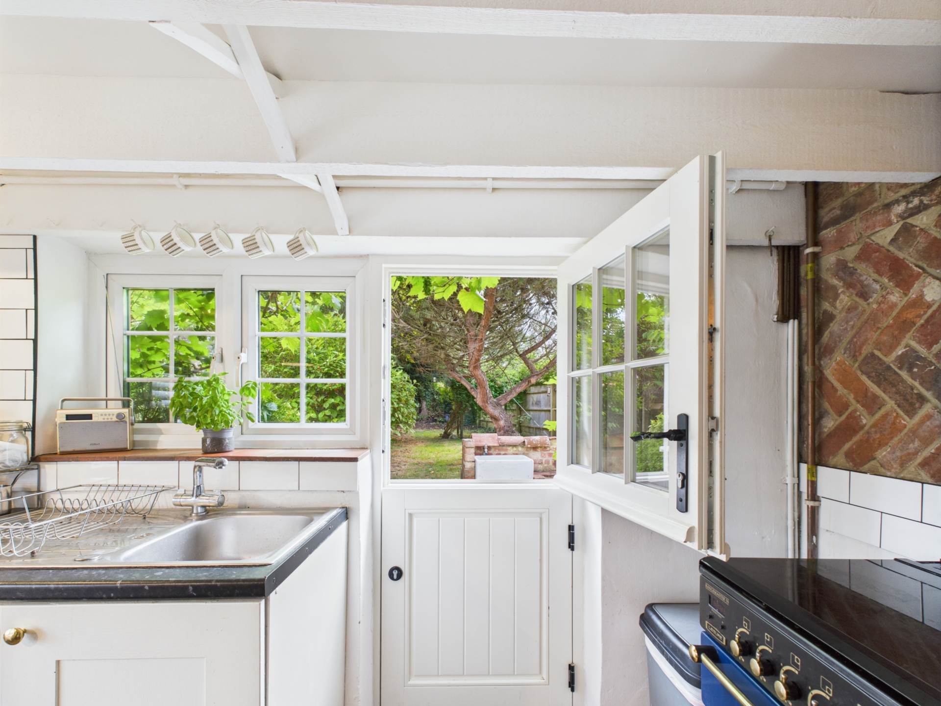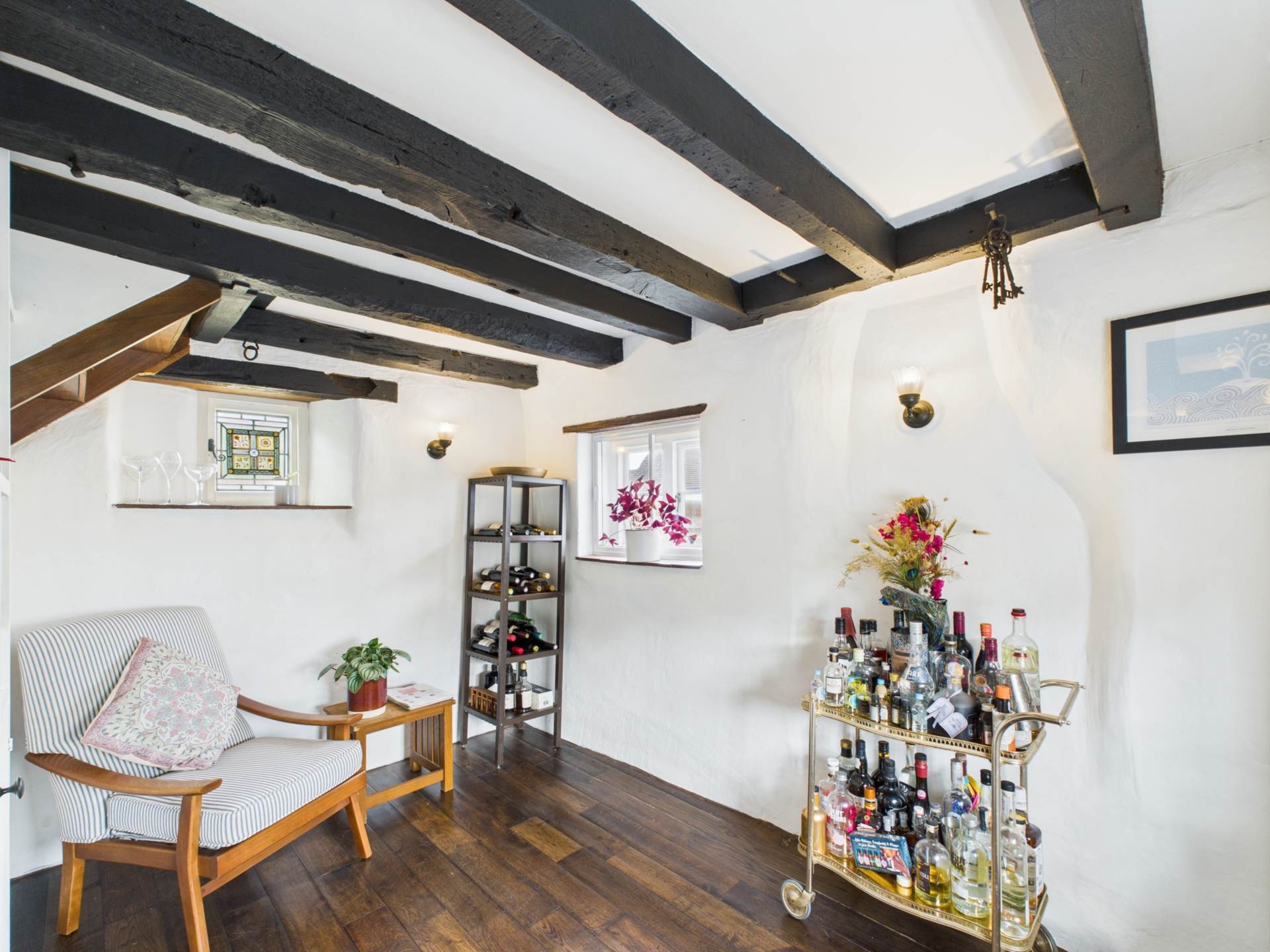 Additional characterful details include quarry-tiled window sills, exposed beams throughout, and a charming split-level staircase, all of which add to the distinctive atmosphere of the home.