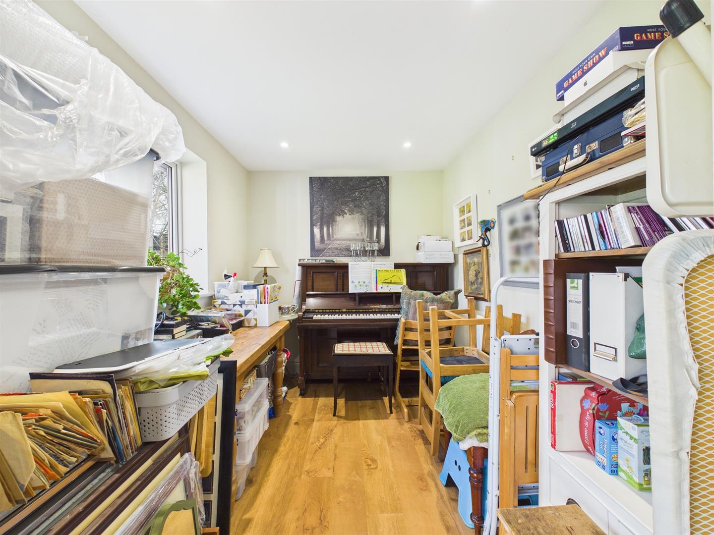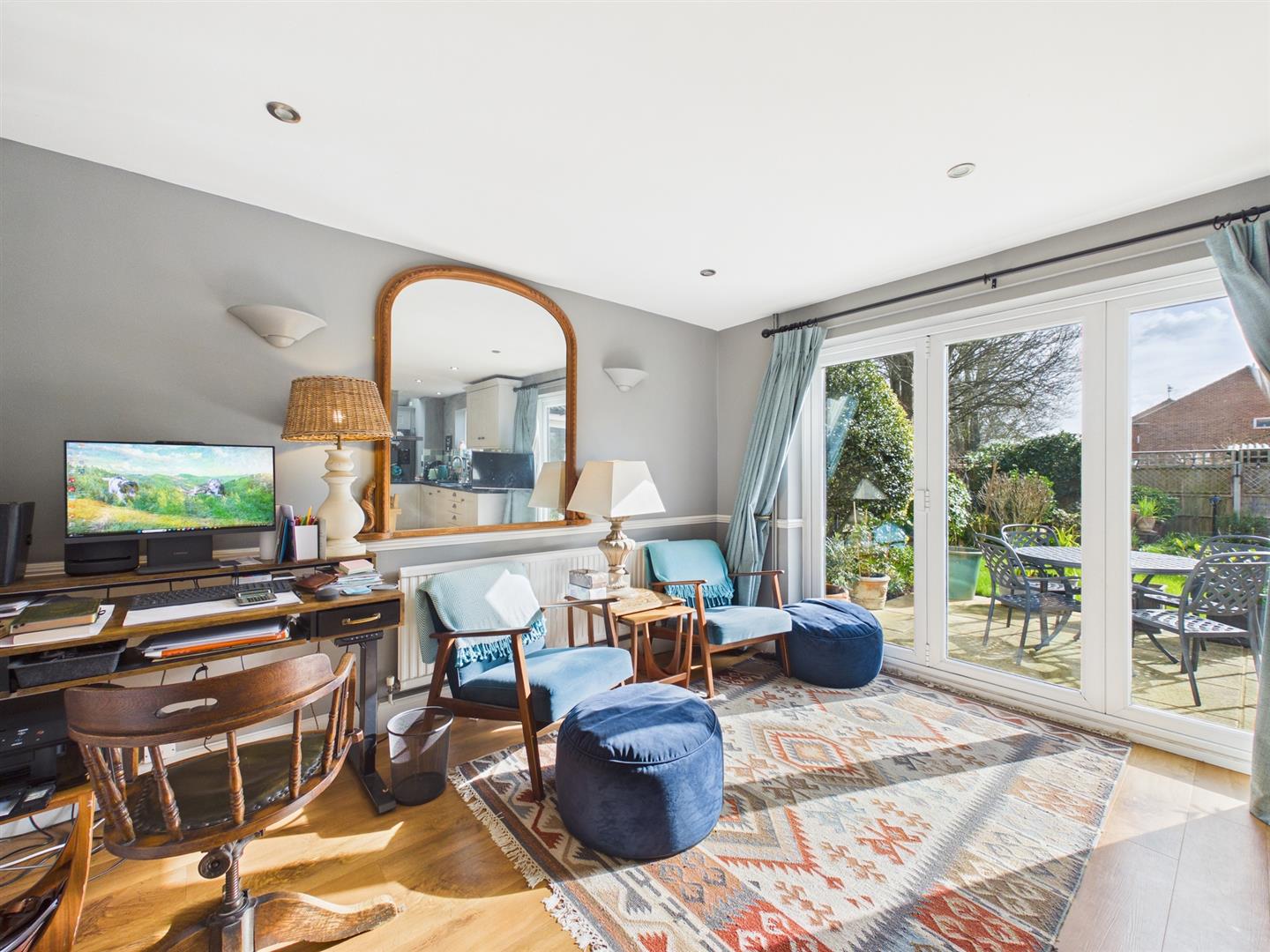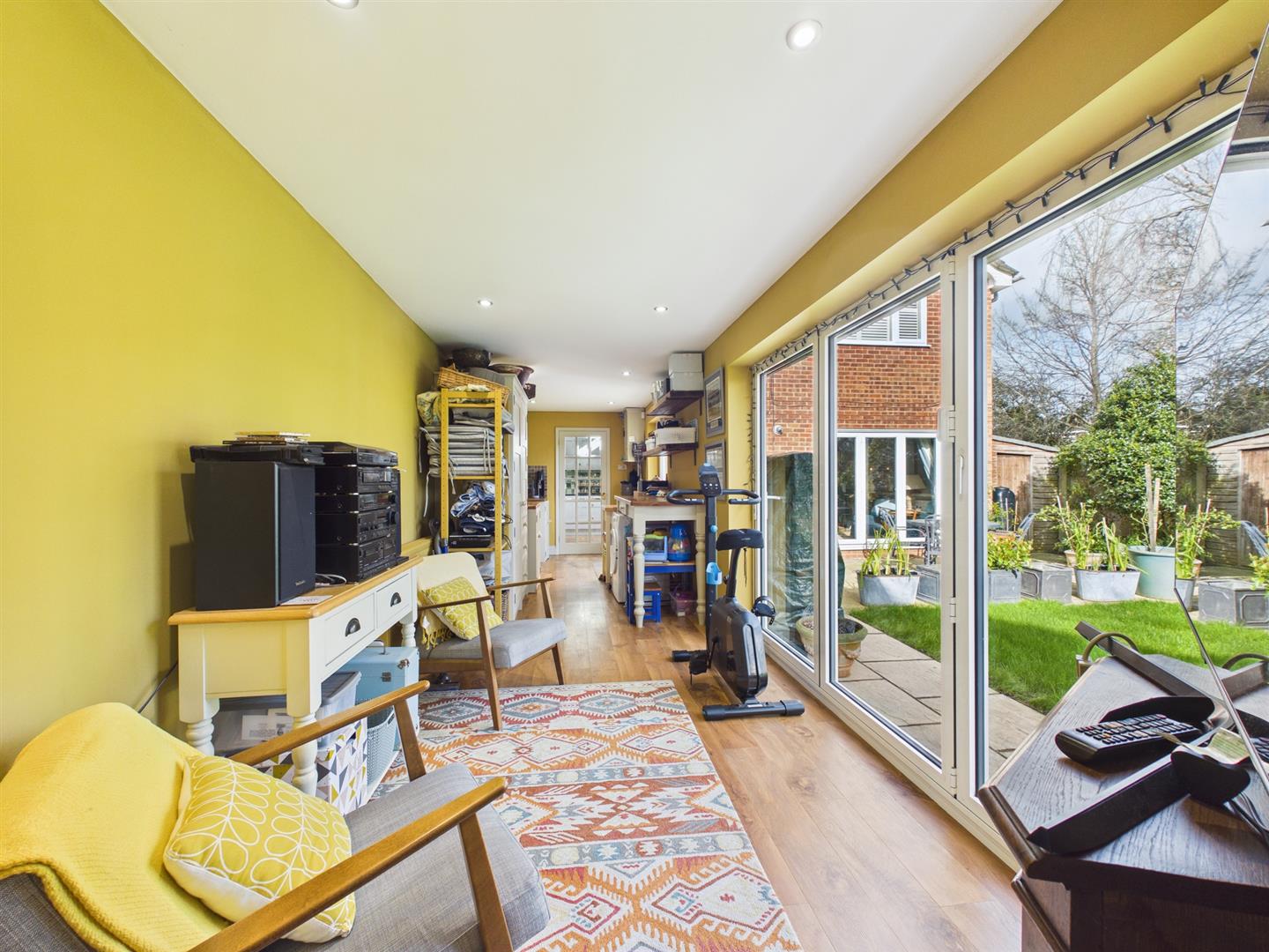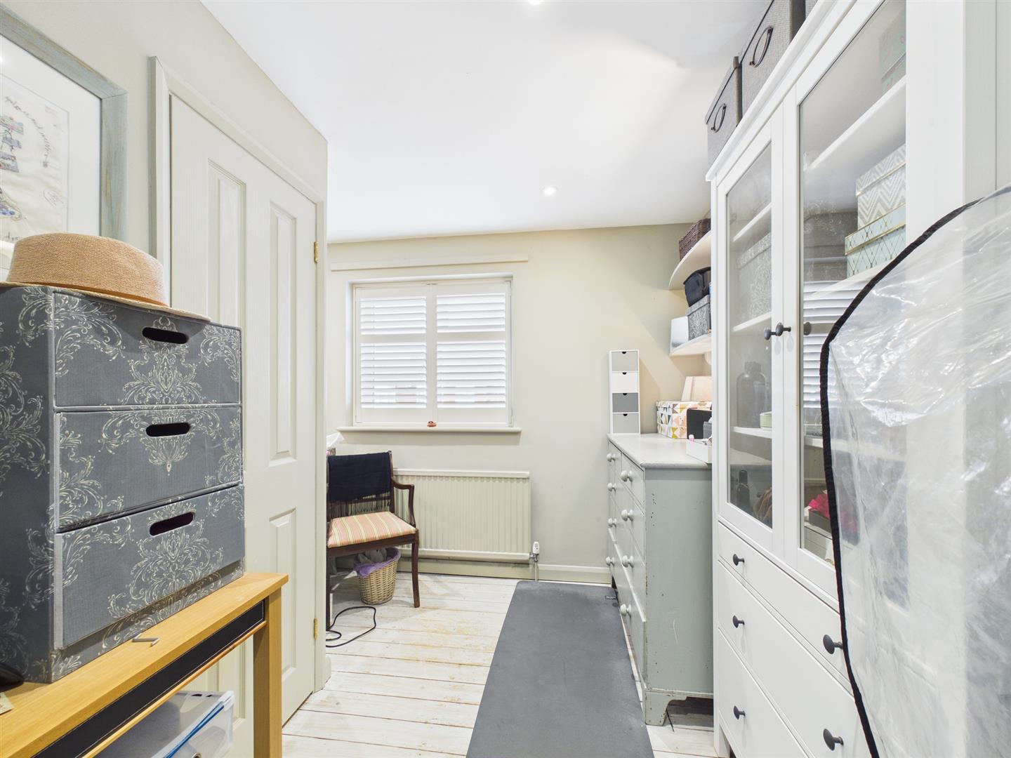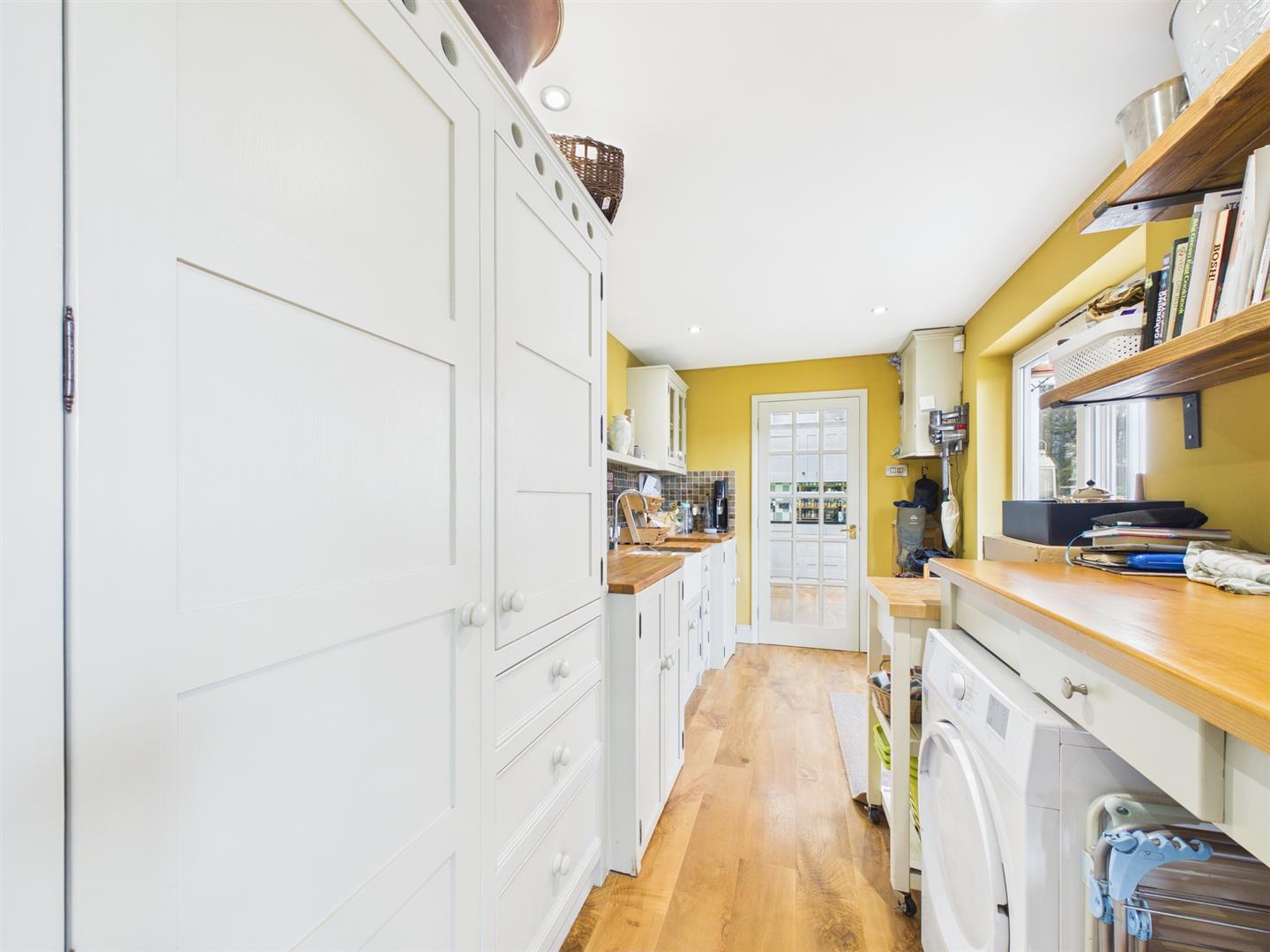 A versatile utility area provides space and plumbing for a washing machine, additional room for furniture, and further doors leading to the garden. This area flows through to a dedicated office, ideal for home working.