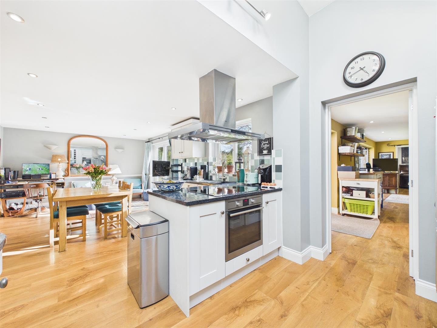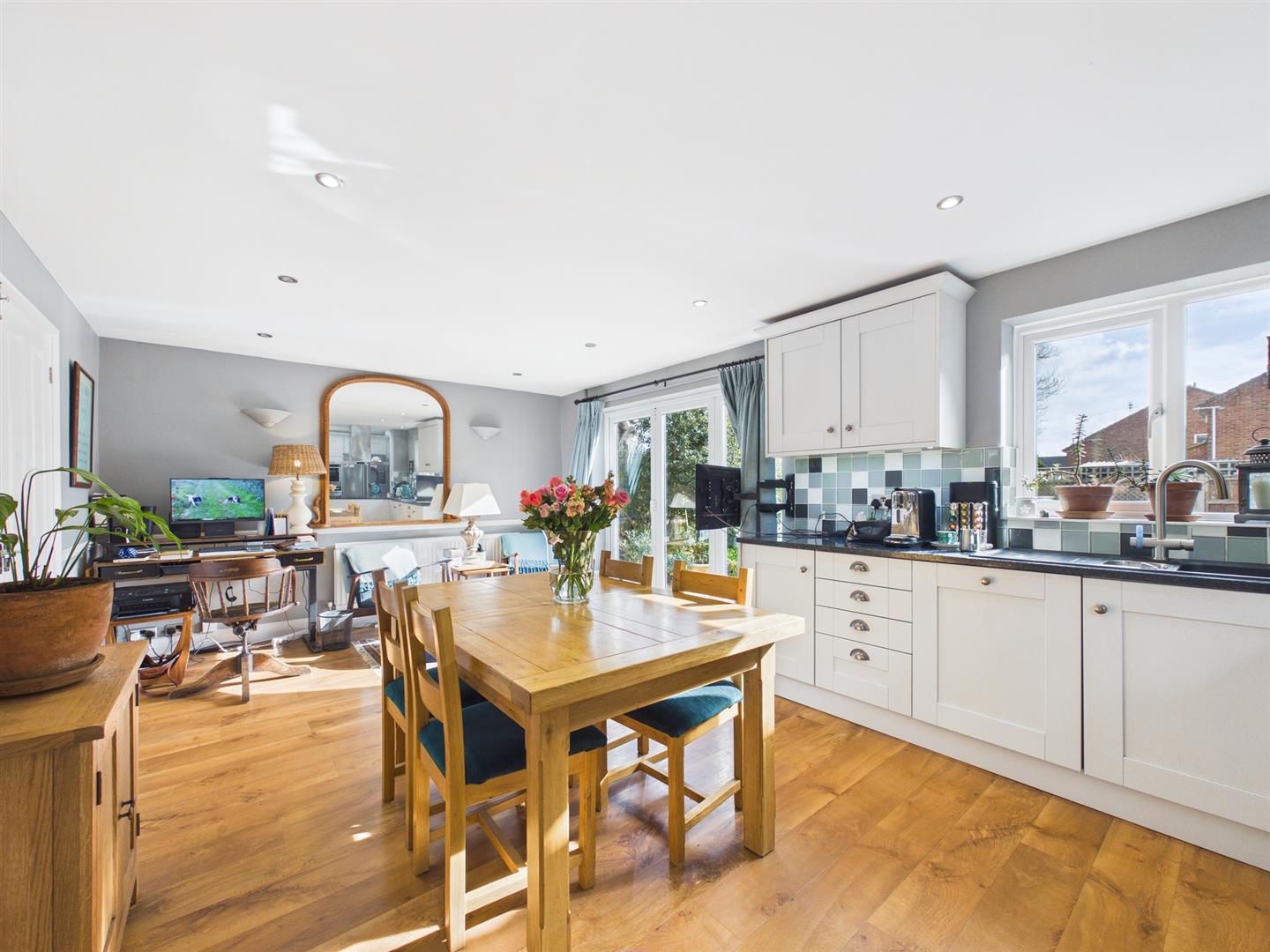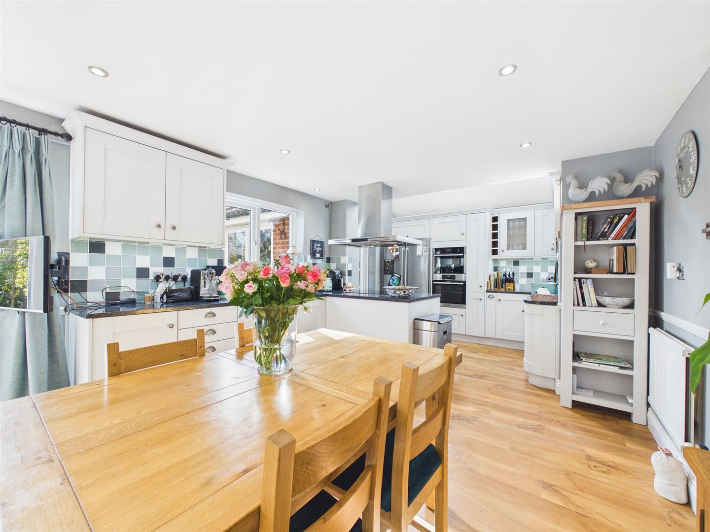 To the rear, the impressive kitchen/dining room is fitted with an inset electric hob, oven below with extractor fan over, integrated double oven and dishwasher, and space for an American-style fridge freezer. There is ample space for a large dining table and additional furniture, while doors open directly onto the garden, allowing for seamless indoor-outdoor living.