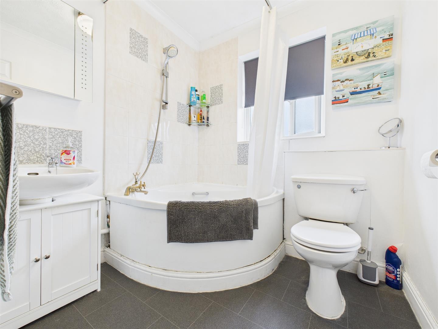 Upstairs, the landing gives access to the loft and an airing cupboard. The double bedroom benefits from a built-in wardrobe, offering practical storage. The bathroom is fitted with a WC, wash basin, and a corner bathtub with a shower attachment.