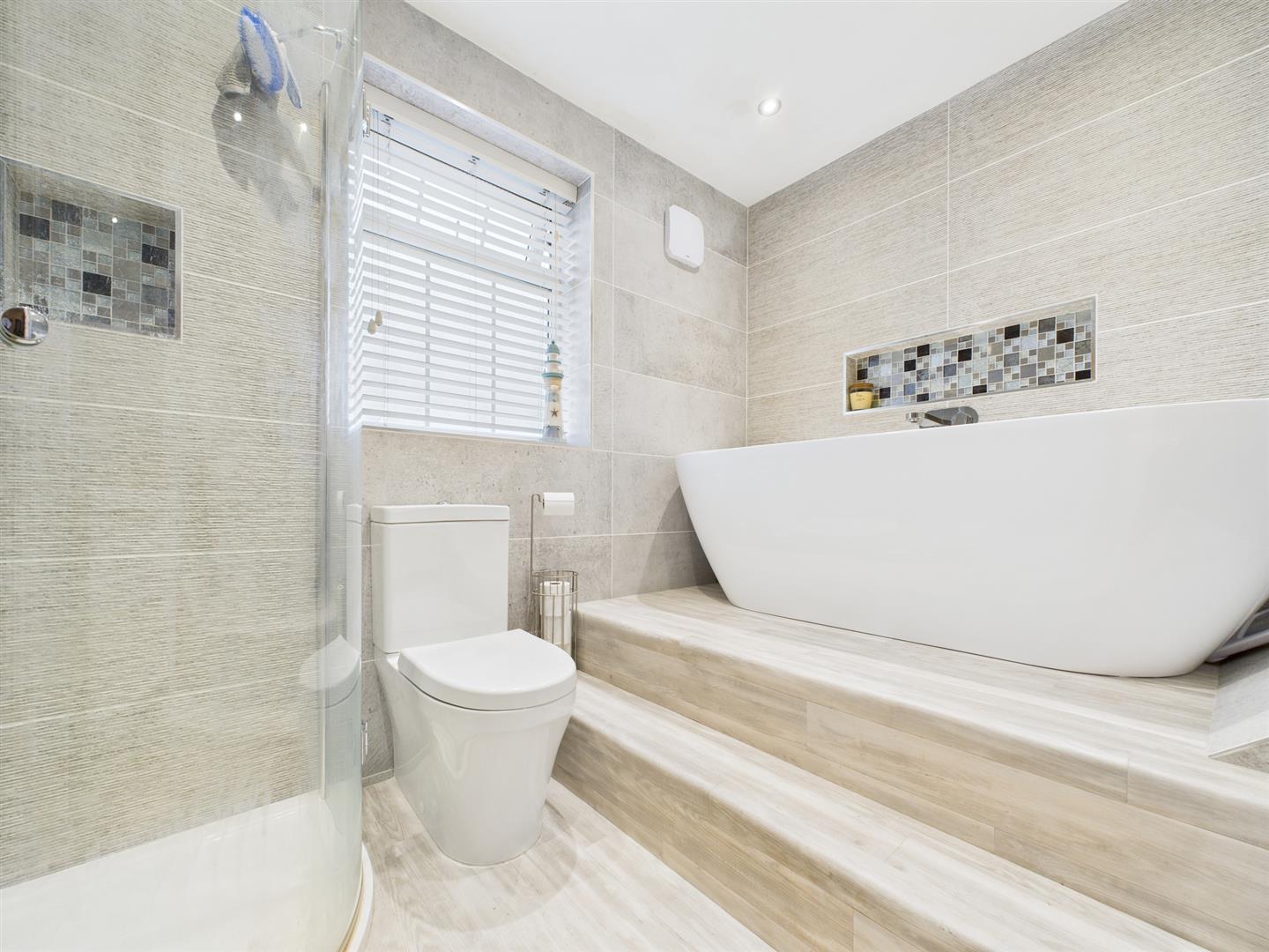 Upstairs, the first floor includes three well proportioned bedrooms and access to the loft is fully boarded for extra storage. The master bedroom benefits from fitted wardrobes and drawers. The family bathroom is fully tiled and fitted with a standalone bathtub, separate shower cubicle, WC, wash basin and heated towel rail.