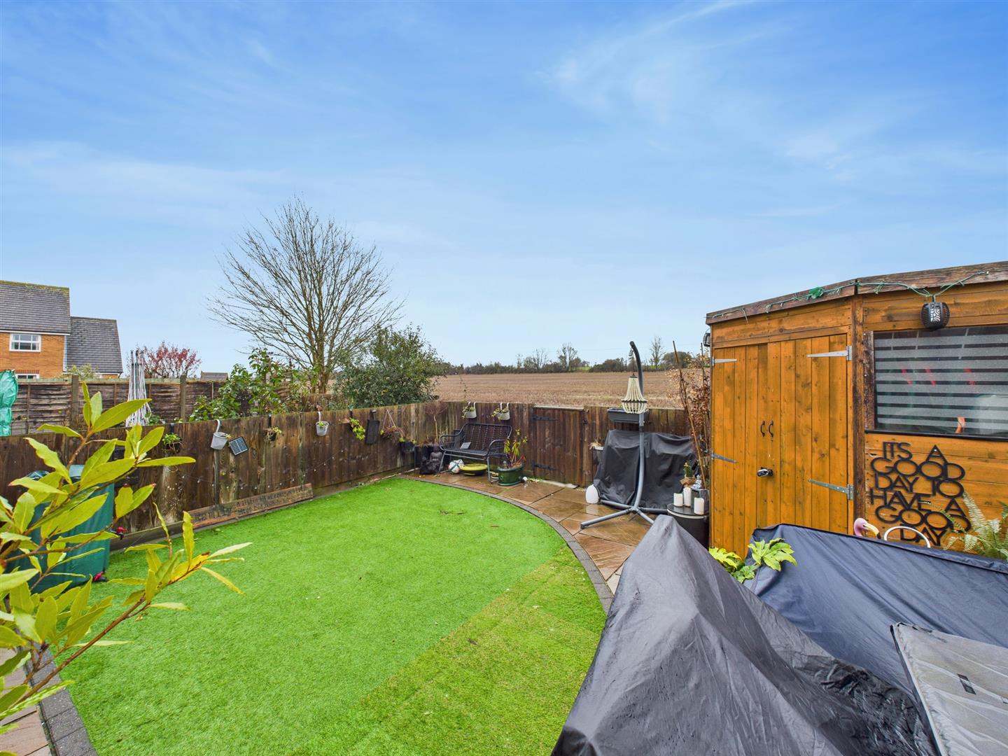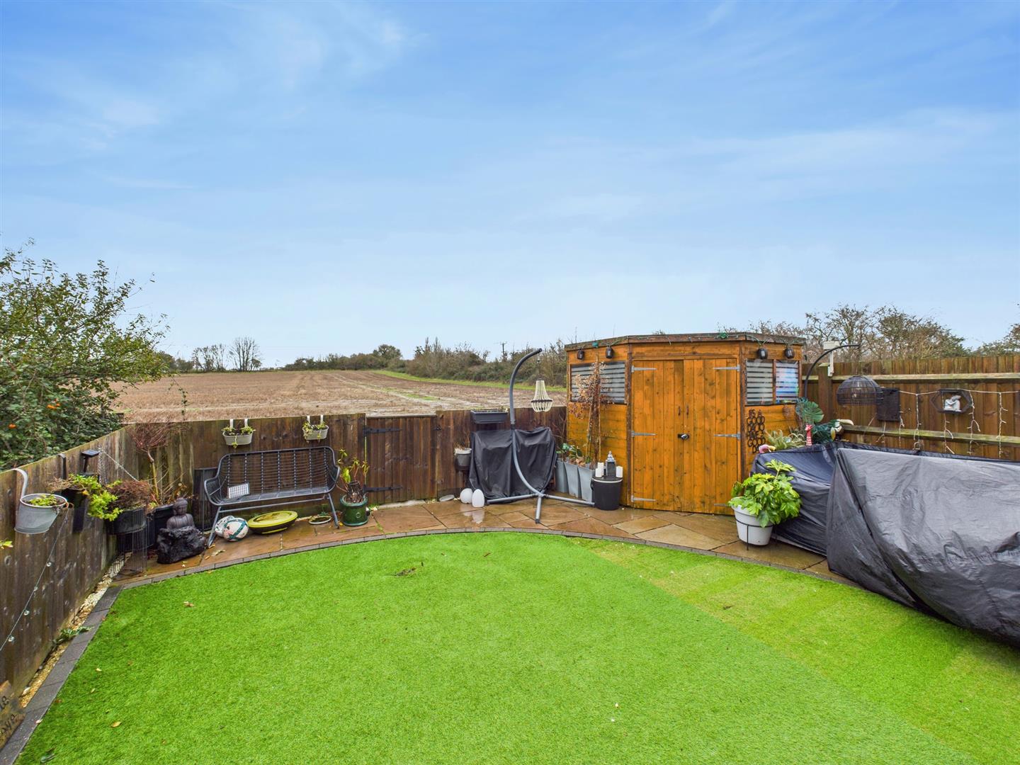 REAR GARDEN - Artificial lawn with patio. Gated rear access directly onto fields behind. Timber shed to remain.