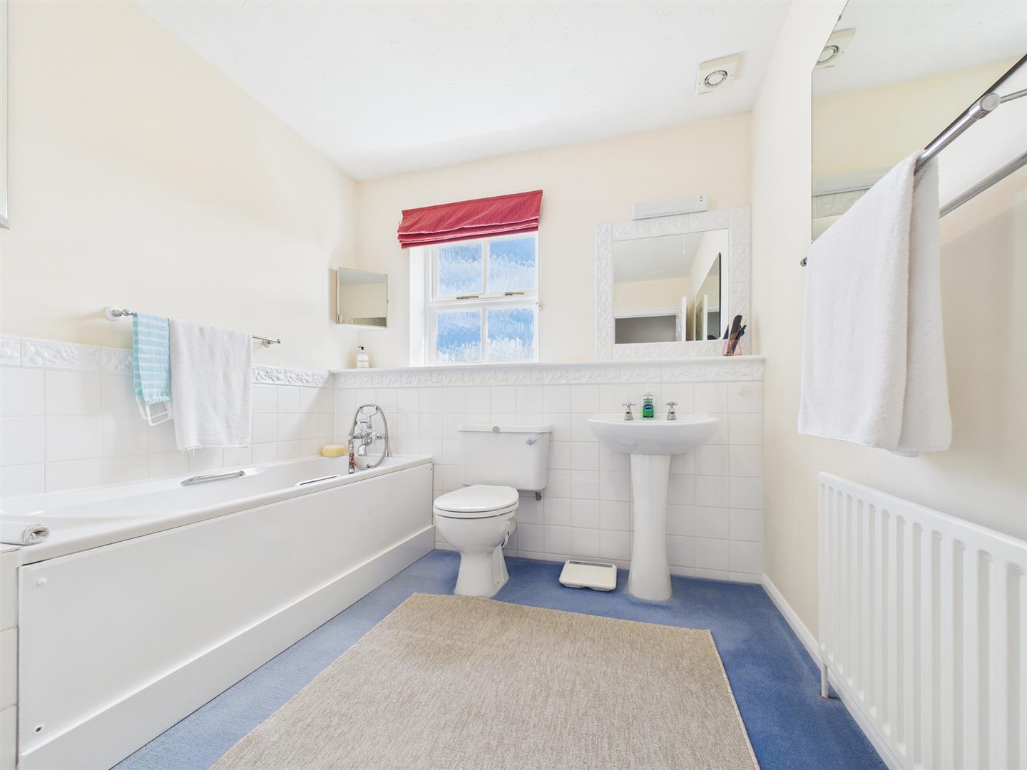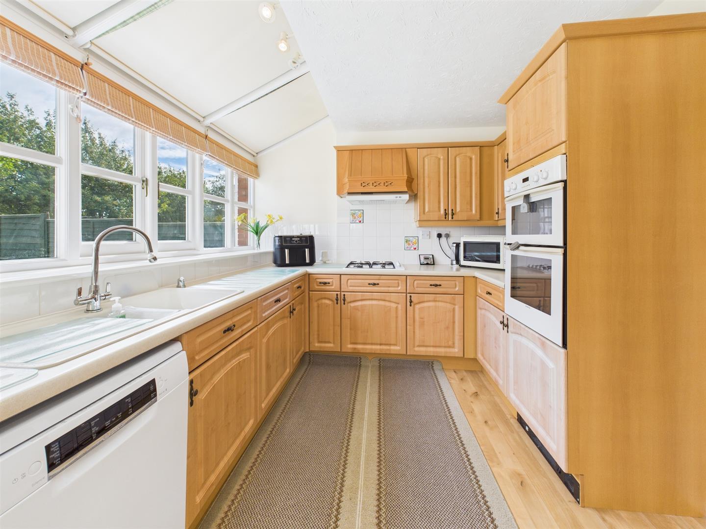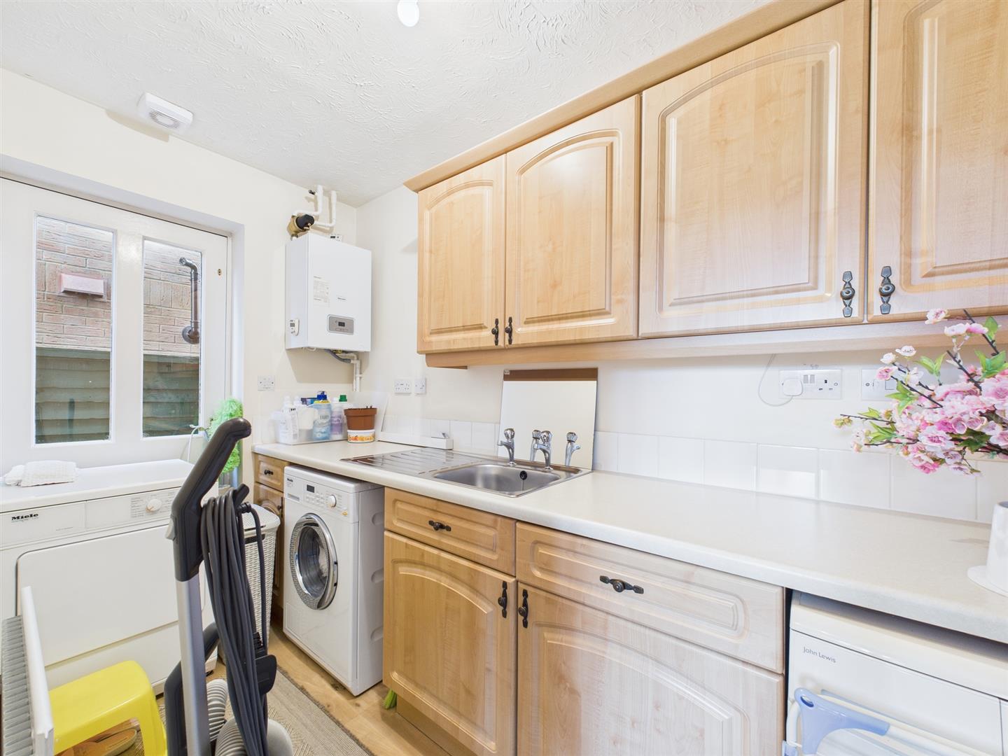 The well-appointed kitchen/diner is fitted with an inset gas hob, oven and grill, with space for a fridge and dishwasher. The dining area enjoys attractive views over the garden, creating a perfect setting for family meals. A separate utility room offers additional storage and space for both a washing machine and tumble dryer.