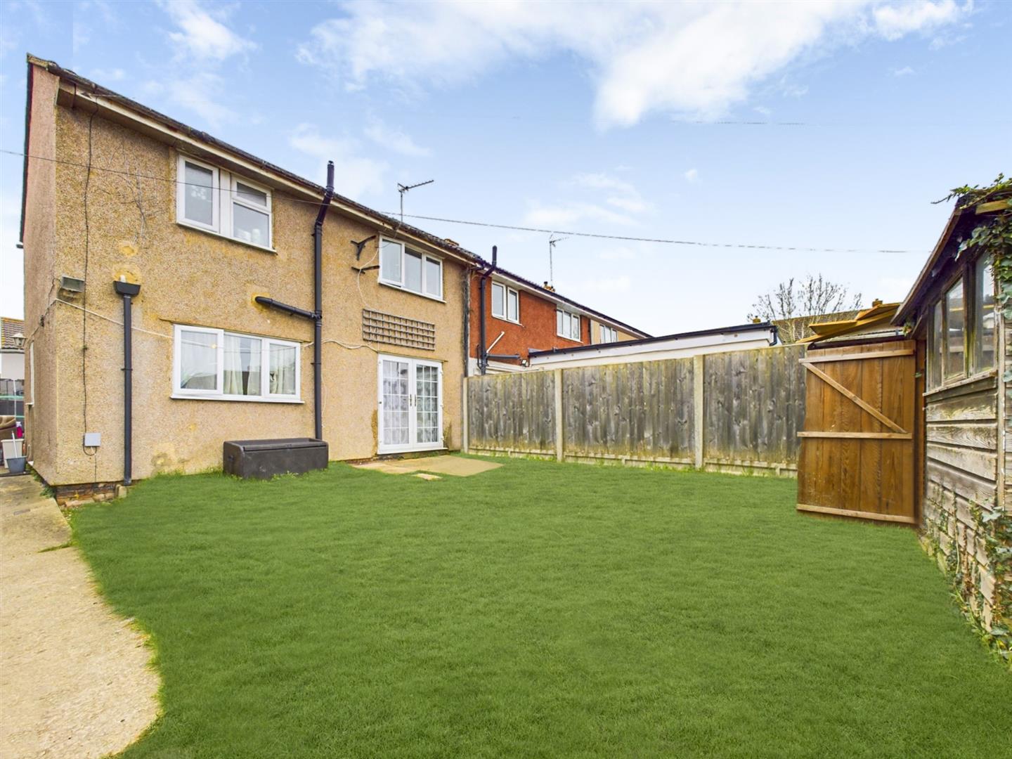 REAR GARDEN - Patio and pathway, grass area, garden shed. Access to the front.
