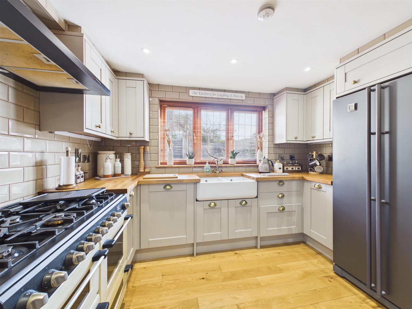 The dual-aspect living room is bright and spacious, with sliding doors opening directly onto the rear garden, allowing plenty of natural light and providing an ideal space for both relaxing and entertaining. The stylish kitchen is well-appointed with a breakfast bar, space for a range-style cooker, an inset butler-style sink, integrated microwave, space for a fridge, and ample worktop and cupboard space.