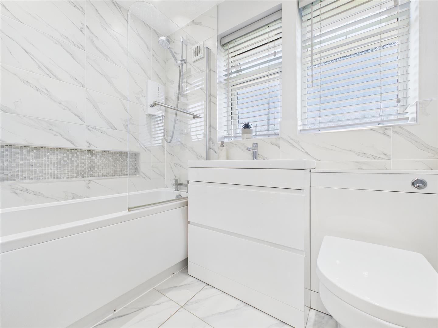 There are three well proportioned bedrooms, each offering flexibility for family use, guest accommodation, or a home office. The modern bathroom suite is sleek and well-appointed, designed with both comfort and convenience in mind.