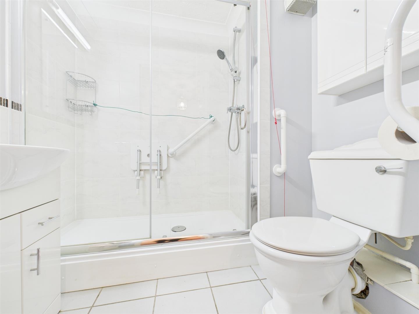 The bedroom is generously sized and comes complete with built-in wardrobes and additional units, providing ample storage for your personal items. The modern shower room is well equipped with a walk-in shower, offering practicality and ease of use.