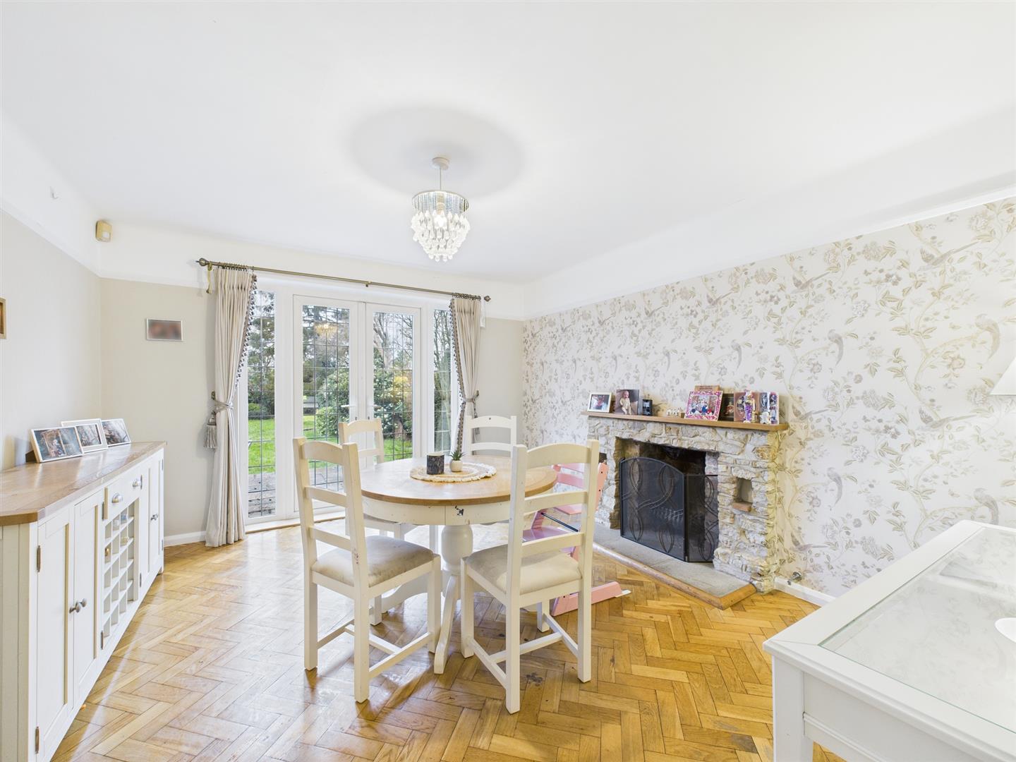 There are multiple reception spaces, including a dining room with a feature fireplace and double doors opening directly onto the rear garden. The living room also benefits from a feature fireplace, offering a warm and comfortable setting. A separate downstairs office provides an ideal home-working space, complemented by a cloakroom.