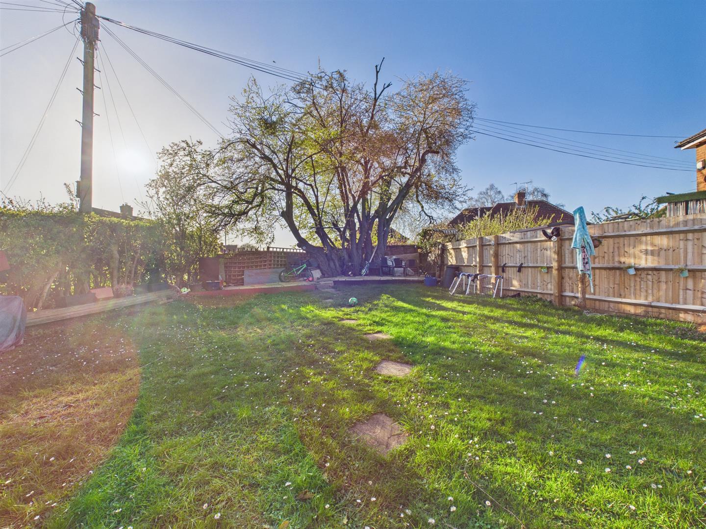 Externally, the rear garden is mainly laid to lawn with a patio seating area, established trees, and an outhouse offering useful storage or potential for further use.