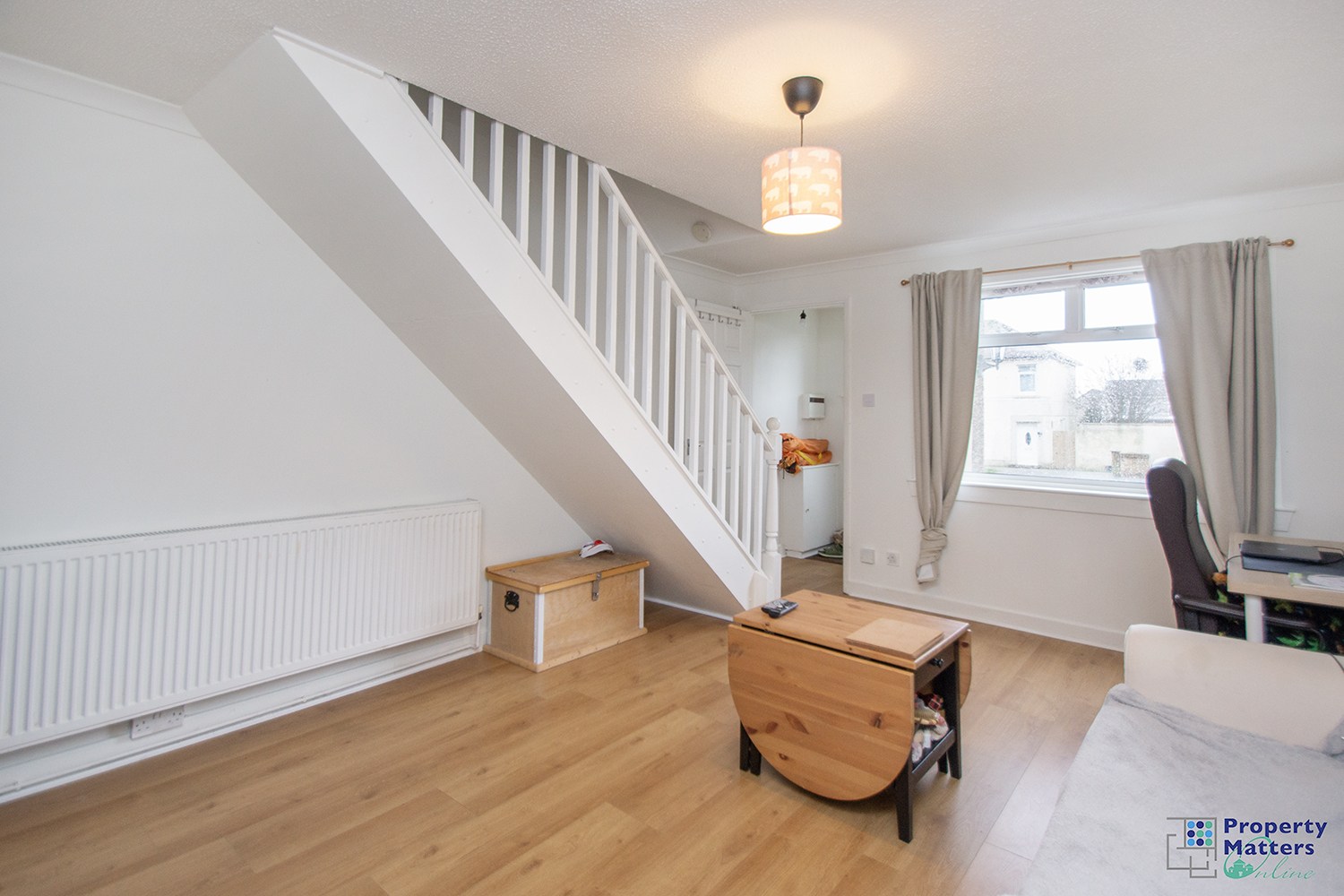 - right, front-facing lounge with natural light and staircase to upper floor